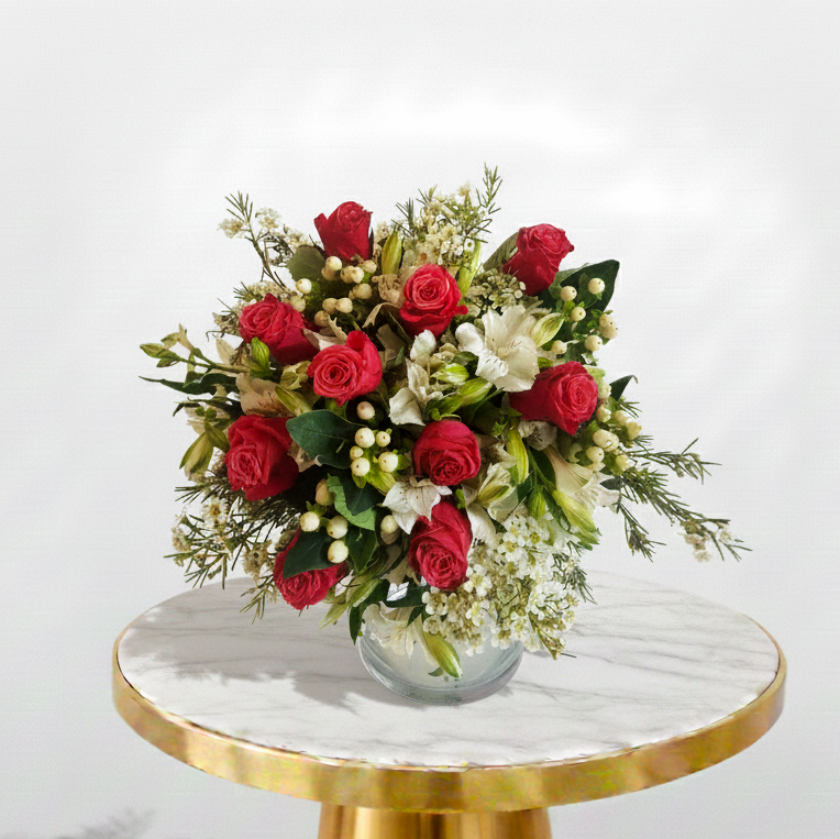 Bring warmth and joy to the season with our Holiday Cheer arrangement — a vibrant mix of 10 fuchsia roses, 5 stems of white alstroemeria, 5 hypericum berries, 5 sprigs of wax flowers, and lush pistacia greenery. Presented in an elegant glass vase, this festive bouquet perfectly balances bold color with soft seasonal charm. Ideal for Christmas gatherings, holiday gifting, or brightening your home in Dubai, each bloom is handpicked for freshness to capture the magic of the season.