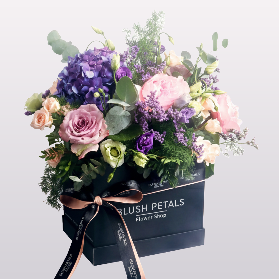 Celebrate in style with the exquisite Purple Rain Box — a vibrant blend of regal purple hydrangeas, romantic pink roses, and elegant purple roses. Accented with soft lisianthus, fresh eucalyptus, and delicate limonium, this hand-crafted arrangement is perfect for sending heartfelt congratulations. Designed by Blush Petals’ expert florists, it brings a burst of luxury and joy to any occasion. Same-day delivery available across Dubai