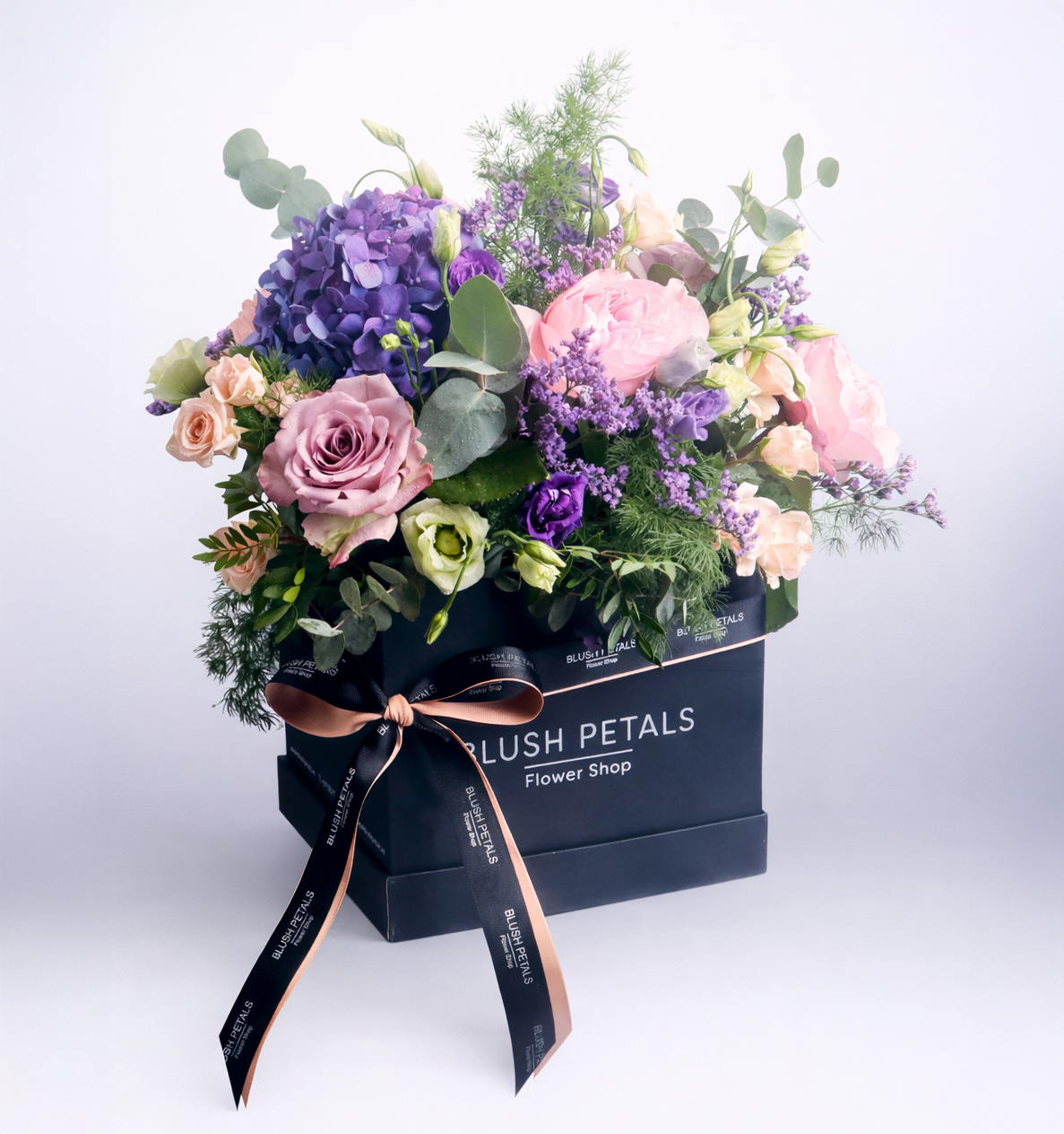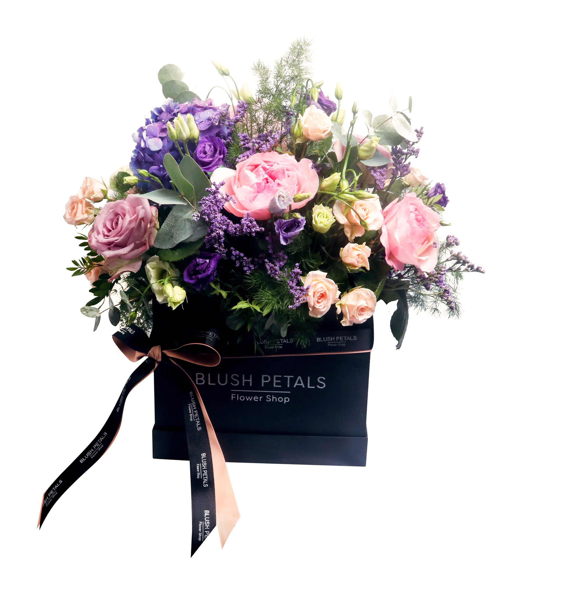 Celebrate the joy of Easter with our elegant Blessings Box. A stunning arrangement featuring soft pink roses, delicate baby peach blooms, romantic purple roses, lush hydrangeas, and charming lisianthus. Accented with limonium, fresh pistacia, and aromatic eucalyptus, this bouquet captures the essence of spring renewal and festive beauty. Perfect for Easter gatherings, thoughtful gifts, or brightening any space with seasonal charm. Handcrafted with love by Blush Petals Flower Shop Dubai for a truly memorable celebration.