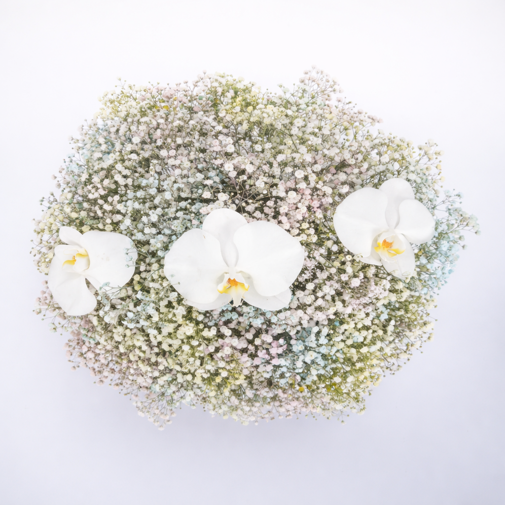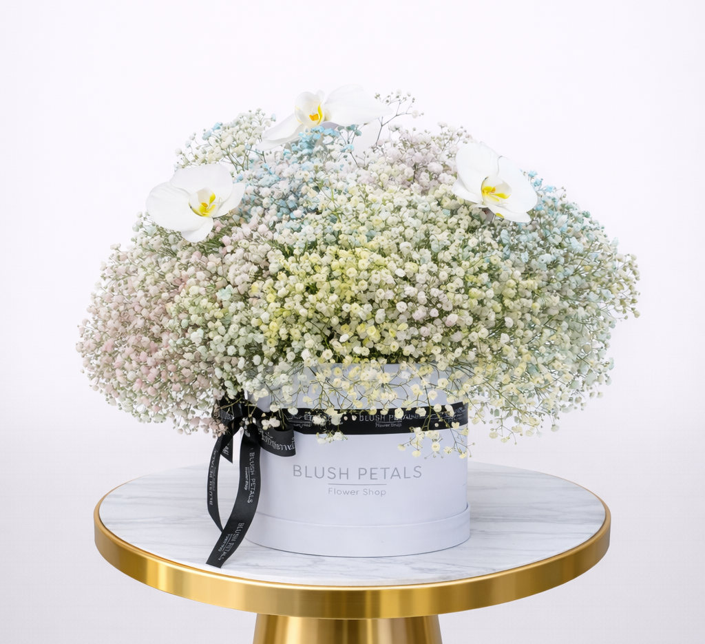 Celebrate Easter with the dreamy elegance of our Rainbow Cloud Box. This enchanting arrangement features 30 stems of delicate gypsophila in soft pastel rainbow shades, paired with a single pristine white phalaenopsis orchid for a touch of luxury. Presented in a chic white hatbox, it’s the perfect blend of whimsy and sophistication. Ideal for Easter gifts, spring celebrations, or as a statement décor piece, this floral design from Blush Petals Flower Shop Dubai brings joy, color, and elegance to any occasion.