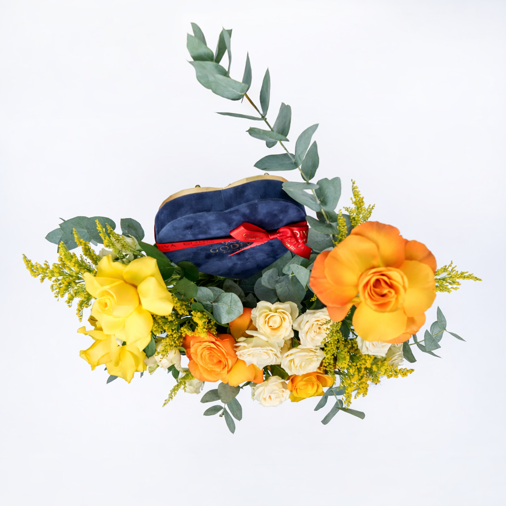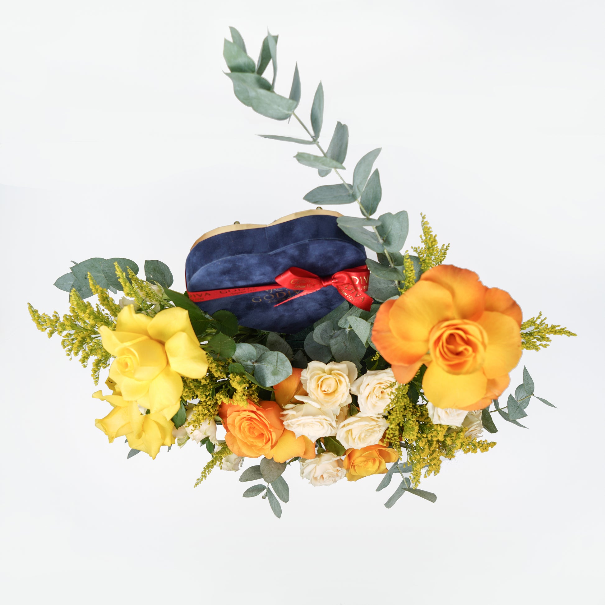 Celebrate the freshness of Easter with our Spring Box, a cheerful blend of beauty and indulgence. This arrangement features delicate baby peach roses, vibrant orange roses, sunny yellow roses, golden solidago, and fresh eucalyptus. To make the gift even sweeter, it includes a luxurious 220g Lindor chocolate box, perfect for adding a touch of decadence to the occasion. Presented in an elegant hatbox, this creation from Blush Petals Flower Shop Dubai is ideal for gifting to loved ones or elevating your festive décor.