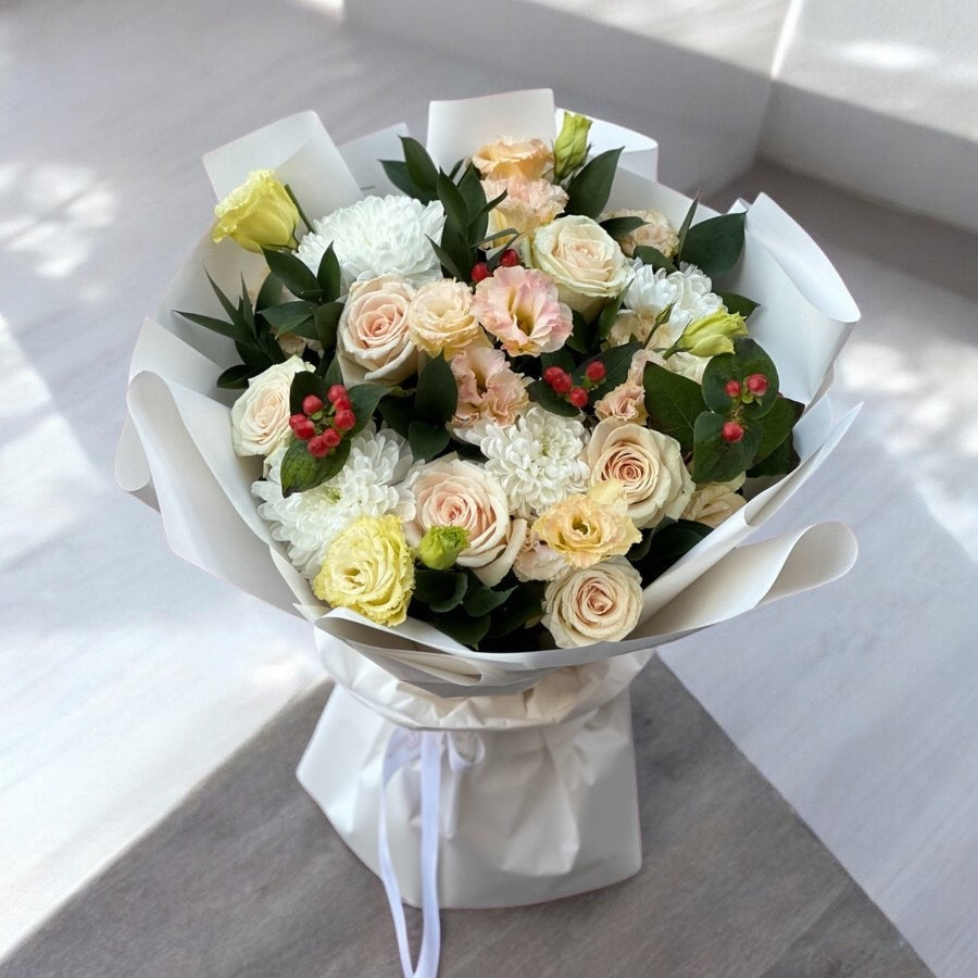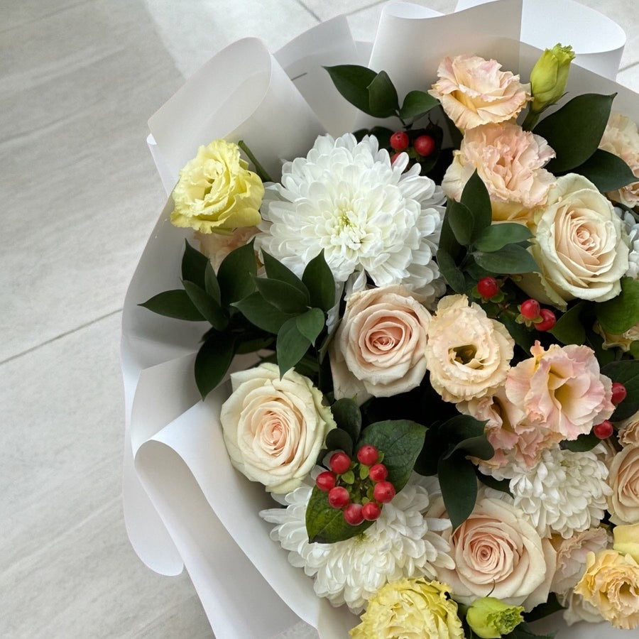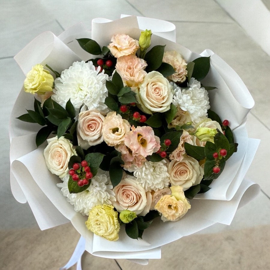 Embrace timeless elegance with Salmeen — a charming mix of pure white chrysanthemums, soft peach roses, delicate lisianthus, and vibrant red hypericum berries. Accented with fresh greenery and wrapped in crisp white paper, this bouquet radiates freshness and warmth. Perfect for birthdays, special occasions, or simply brightening someone’s day. Same-day delivery available across Dubai.