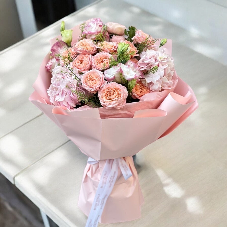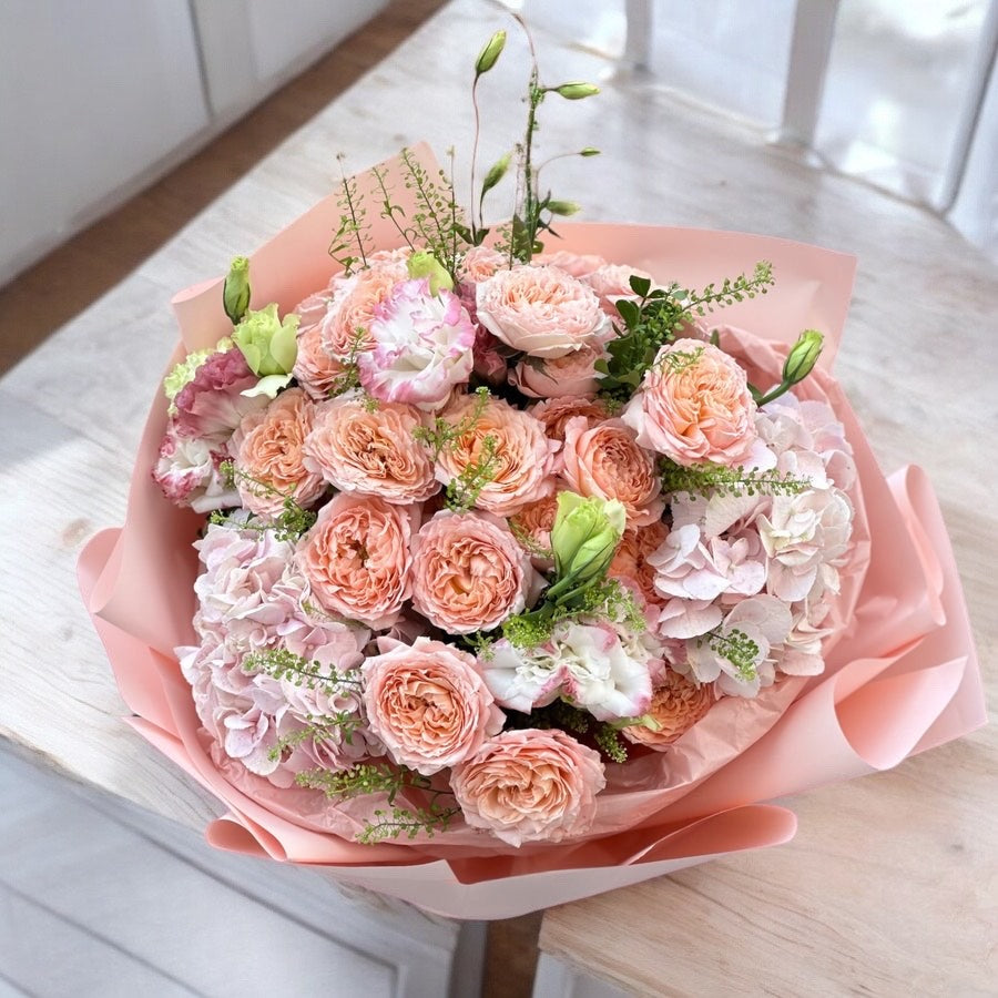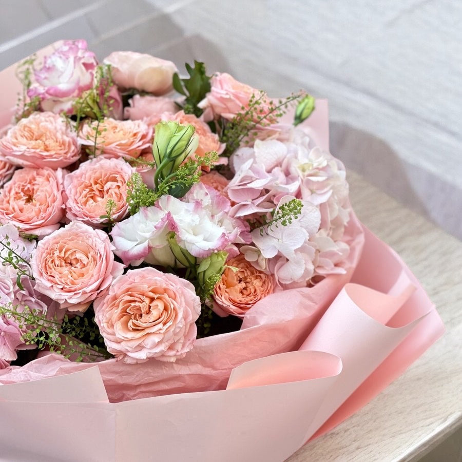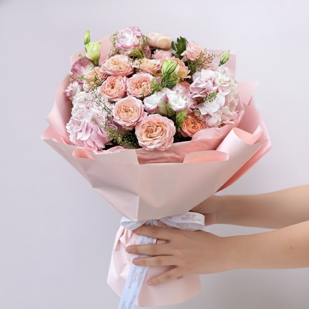 Welcome the newest little princess with our Cutie Baby Girl bouquet — a tender arrangement of blush pink hydrangeas, delicate baby roses in peach and pink, and fresh white lisianthus. Wrapped in soft pastel pink, this bouquet is the perfect way to celebrate a baby girl's arrival, bringing sweetness, charm, and joy to the special moment. Ideal for hospital deliveries, baby showers, and welcome-home celebrations in Dubai.