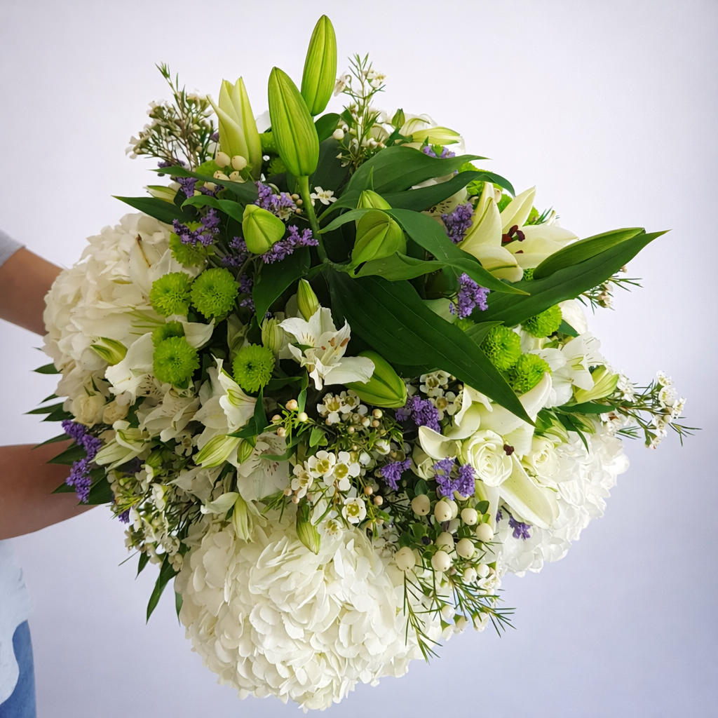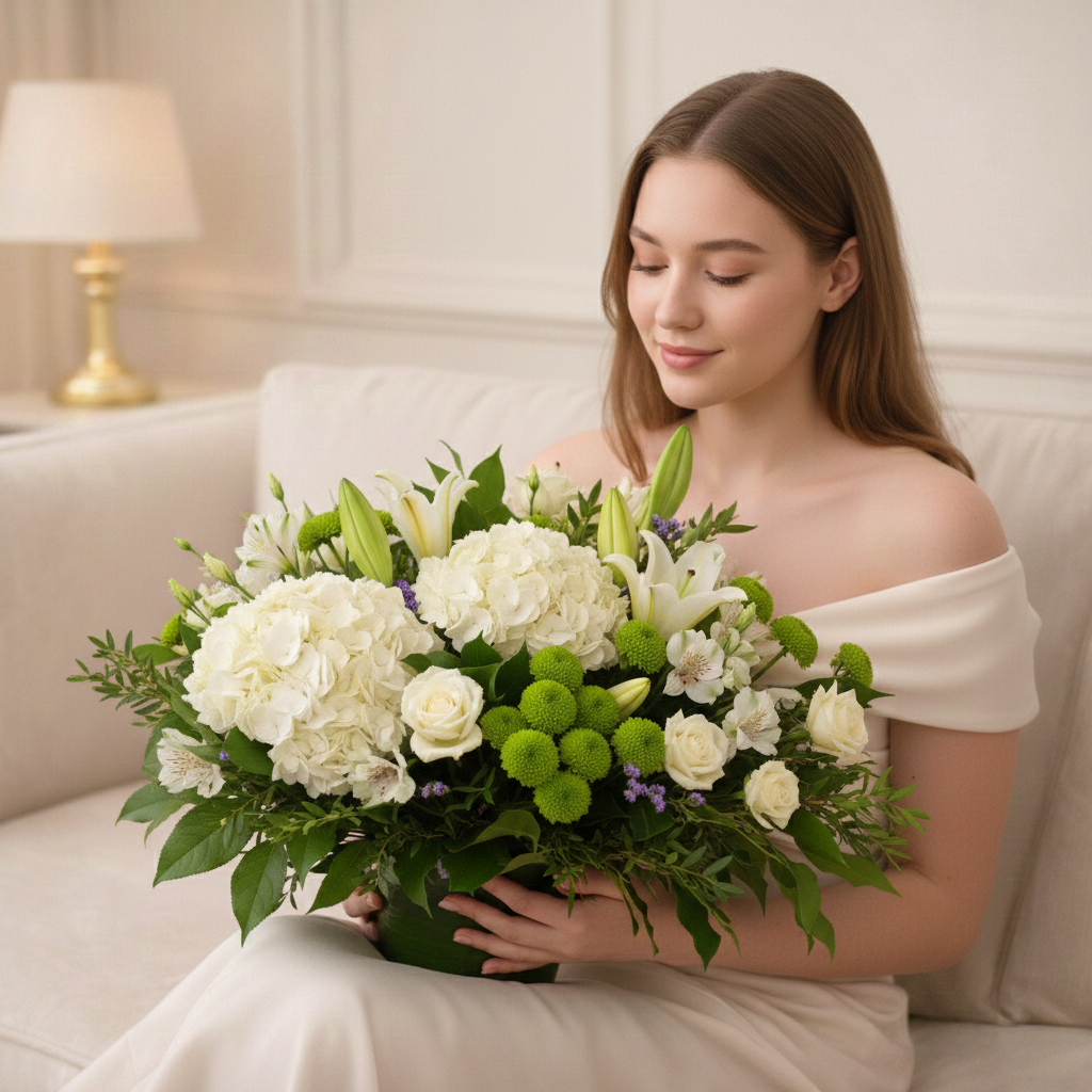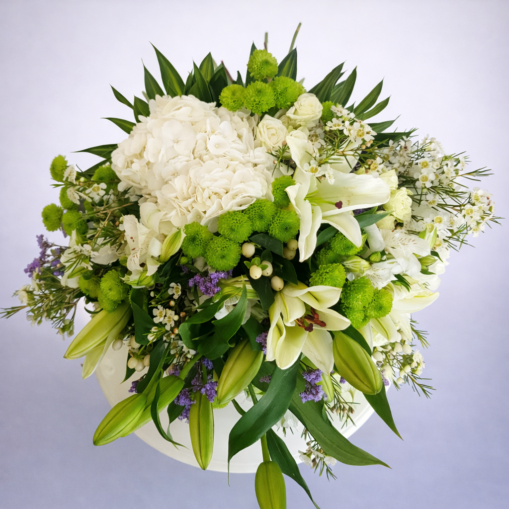 Brighten their day with the timeless elegance of our Pure Heart bouquet. Featuring 3 lush white hydrangeas, 5 pristine white Asiatic lilies, 4 fresh green chrysanthemums, 4 stems of white hypericum, 5 sprigs of limonium, and 5 delicate wax flowers, this arrangement radiates purity and peace. Perfect for sending Get Well Soon wishes, it’s a sophisticated gesture of care and positivity. Available for same-day delivery in Dubai.