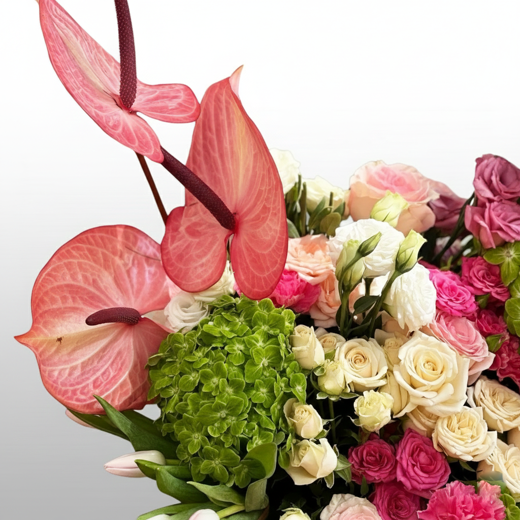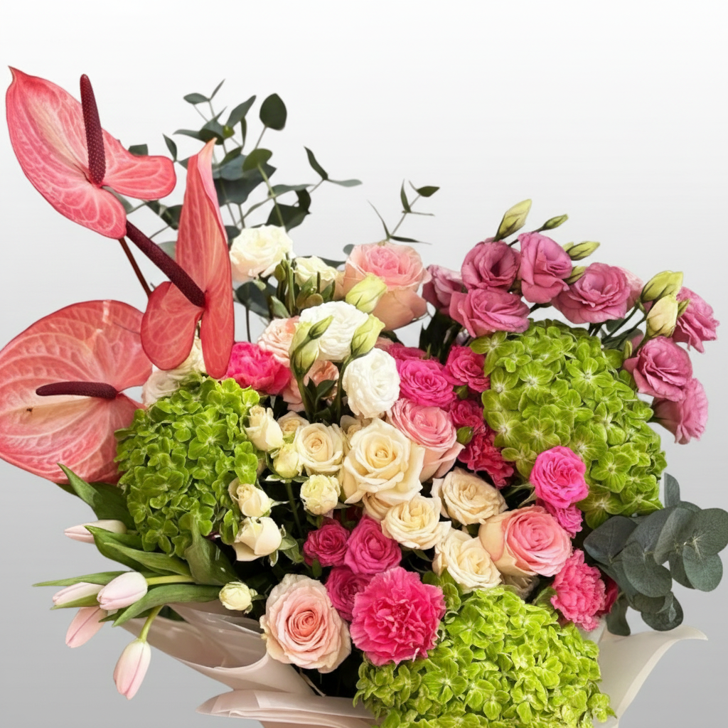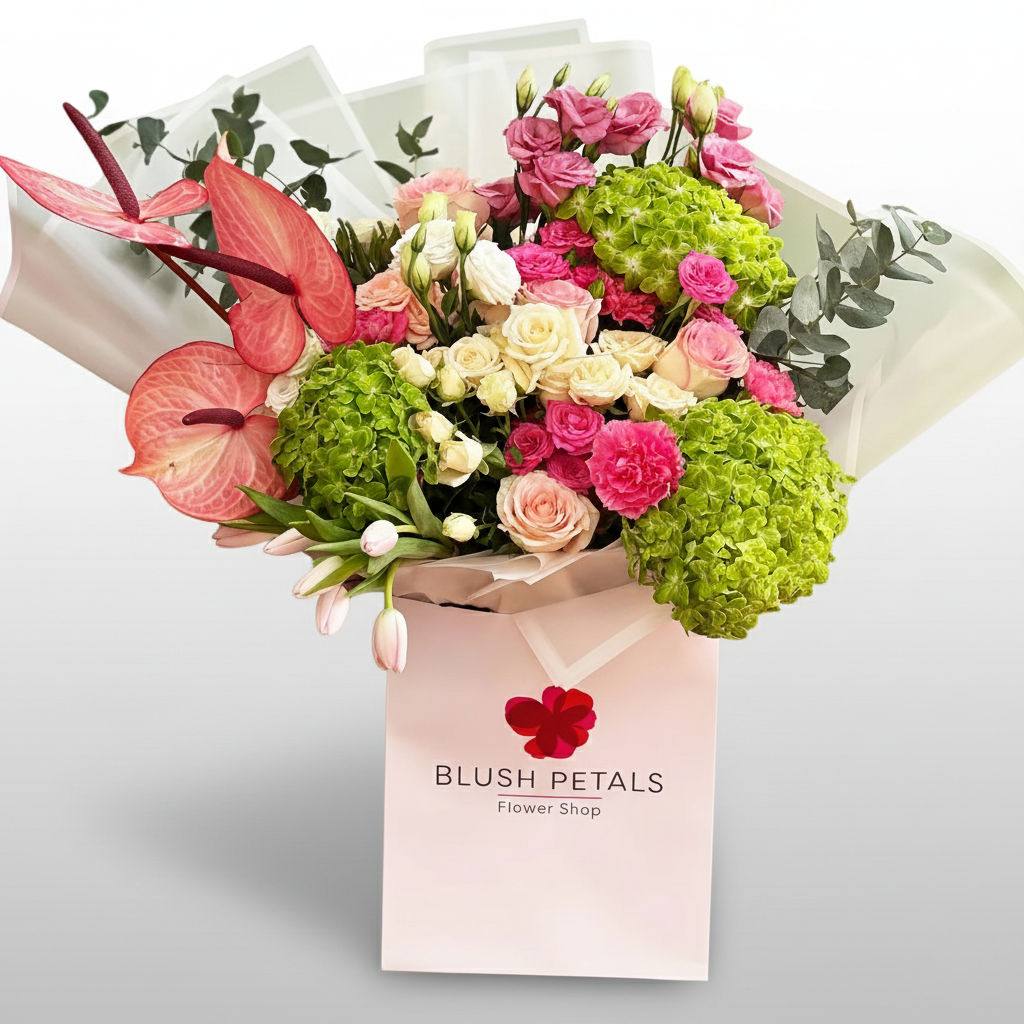 Wrap your love in elegance with Gentle Embrace, a sophisticated flower bag arrangement featuring lush green hydrangeas, romantic pink roses, fuchsia spray roses, and delicate peach and white spray roses. Accented with striking anthuriums, pink tulips, carnations, lisianthus, and fresh eucalyptus, this luxurious bouquet is perfect for anniversaries, romantic surprises, and heartfelt celebrations in Dubai.