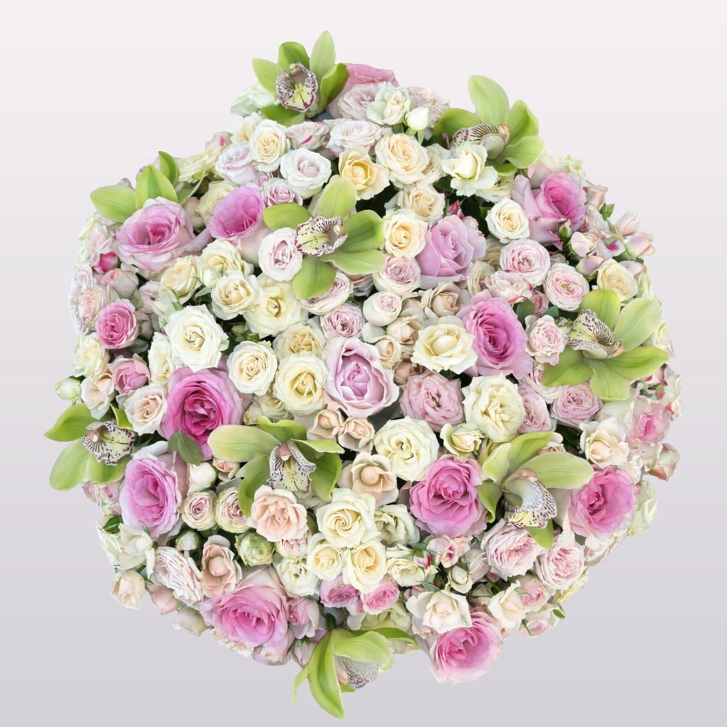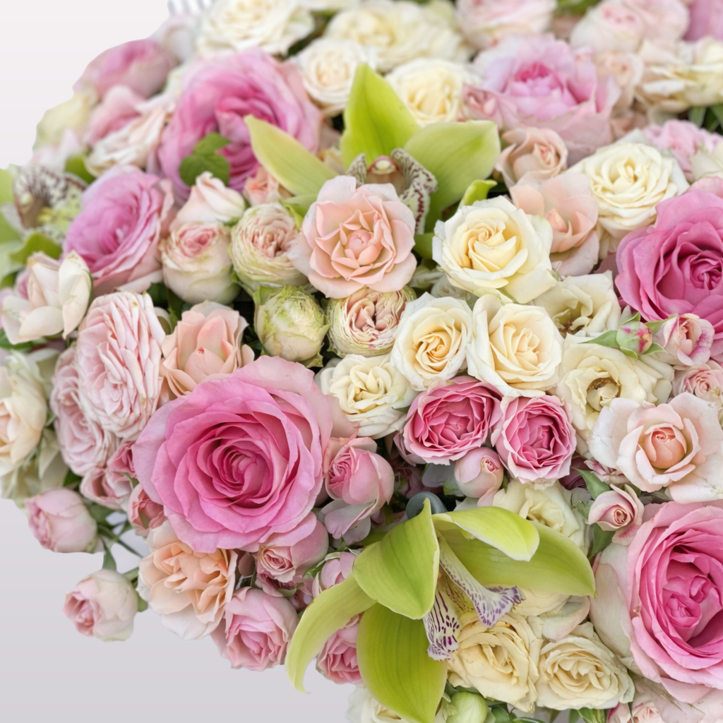 The Enchantment Box is where luxury meets romance. Featuring 15 lush pink roses, 15 delicate pink baby roses, 15 soft peach baby roses, and a striking green cymbidium orchid, this exquisite hatbox arrangement is handcrafted by Blush Petals Dubai to create an unforgettable impression. Perfect for birthdays, anniversaries, weddings, or heartfelt surprises, its harmonious blend of colors and blooms brings both elegance and joy. With same-day flower delivery in Dubai, the Enchantment Box is the ultimate statement of love and sophistication