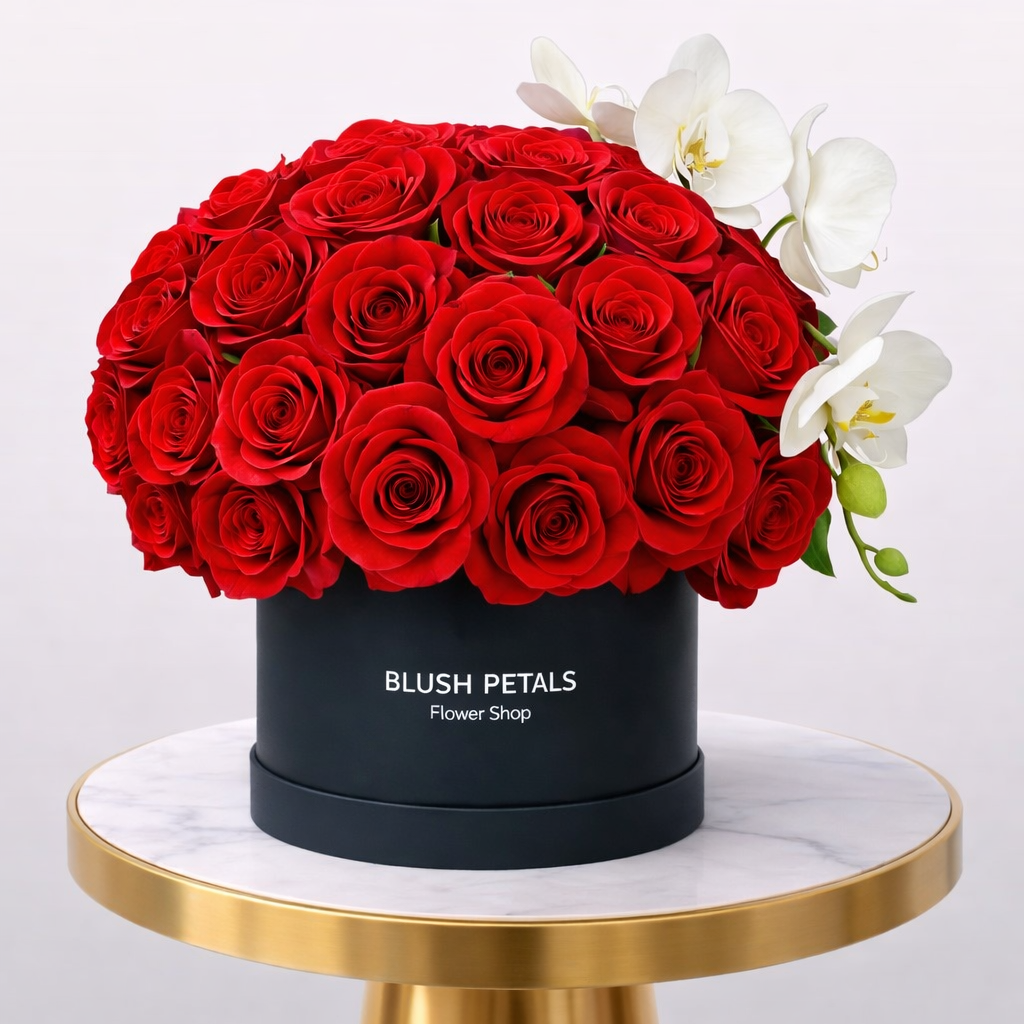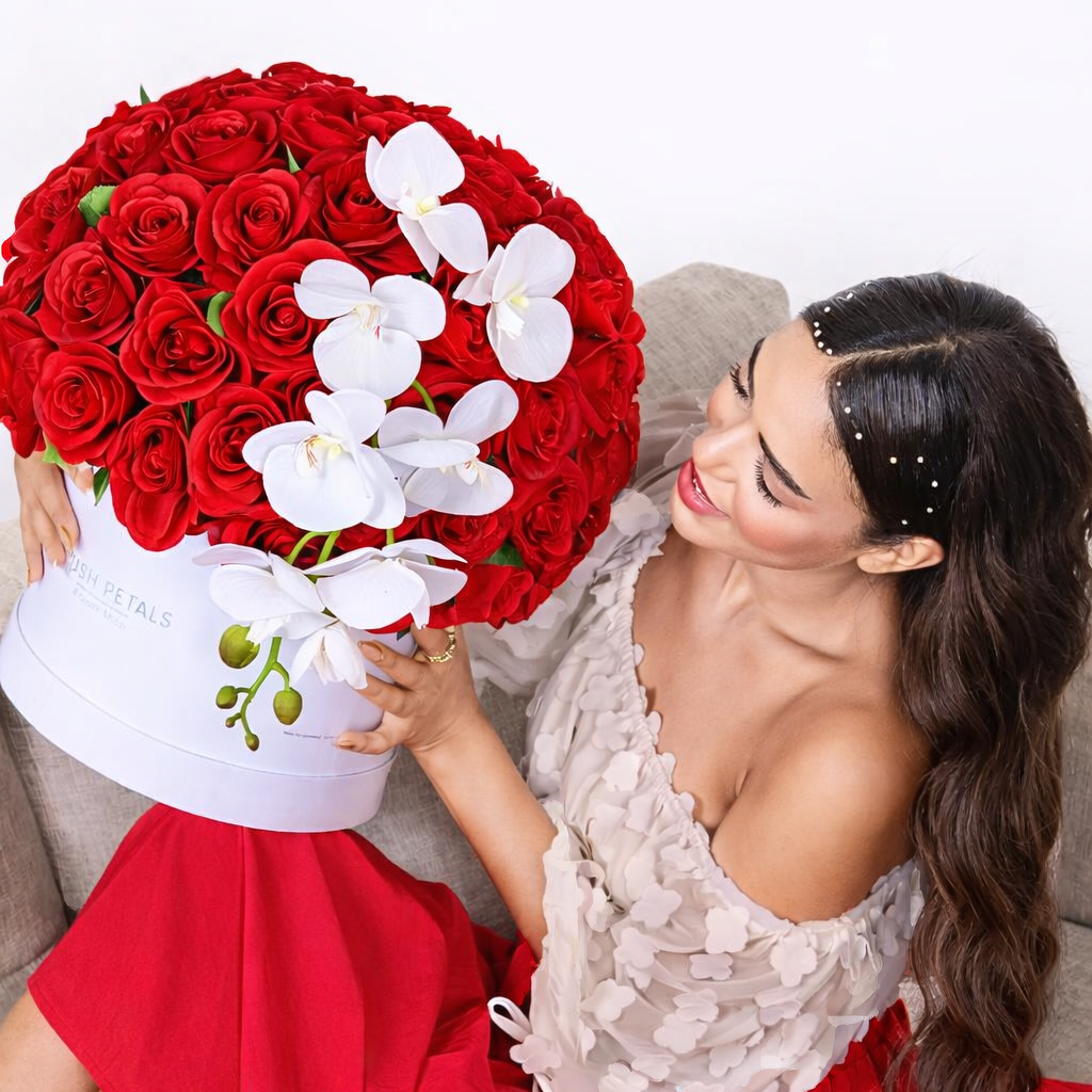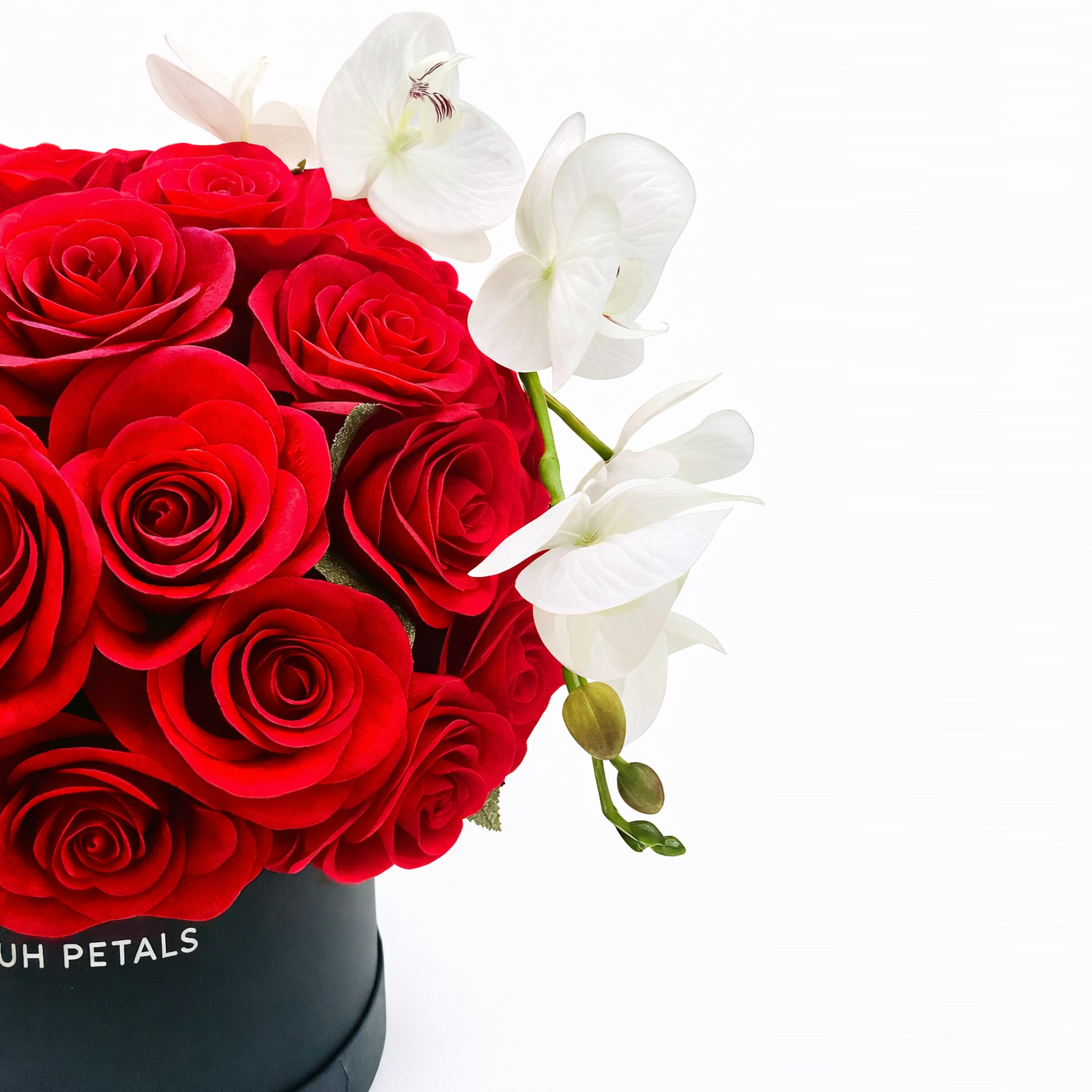 Express love with unmatched elegance through the Heart Beat Box, a luxurious arrangement of velvety red roses paired with delicate white phalaenopsis orchids. Handcrafted in our signature hatbox, this premium floral gift captures the rhythm of romance and sophistication.