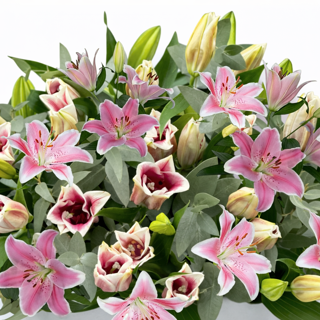 Step into a floral dream with Lilies Enchanted Garden, a luxurious arrangement of pink oriental lilies and lush greenery, elegantly displayed in our signature white hatbox. Radiating charm, freshness, and sophistication, this bouquet is designed for those who appreciate natural beauty with a luxurious twist.