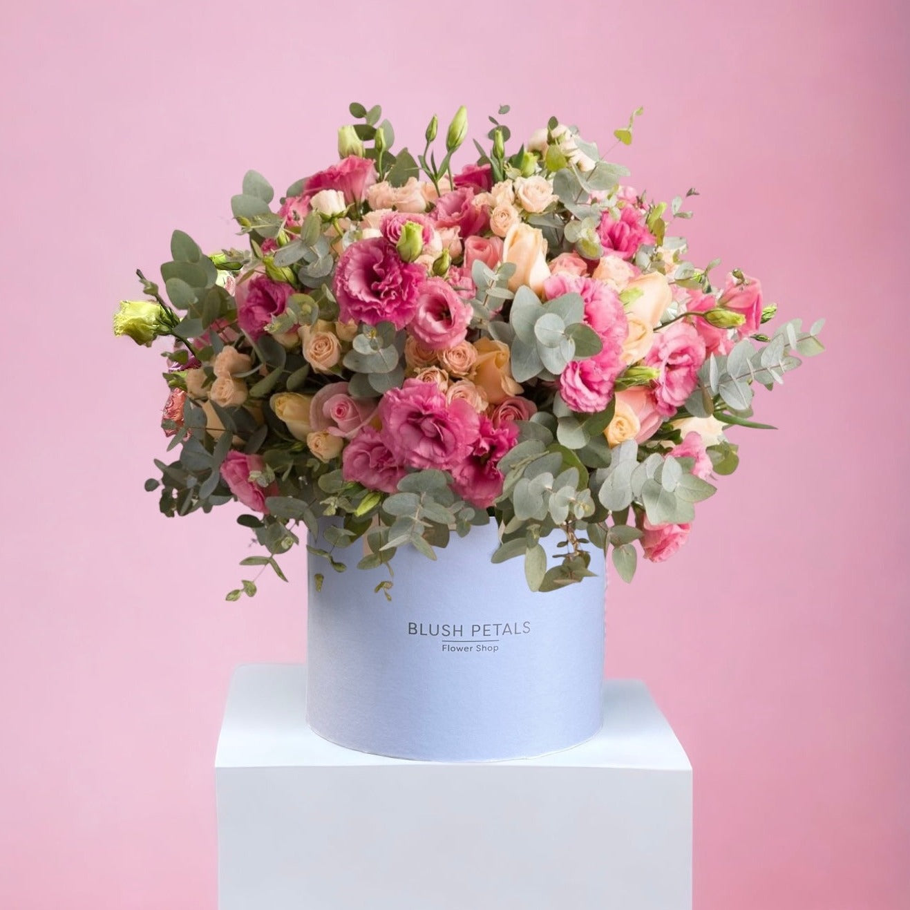 Bring joy and elegance together with our Starburst Box – a radiant floral creation handcrafted with 15 lisianthus, 8 pink roses, 5 baby peach roses, and 5 stems of fresh eucalyptus. Each bloom is thoughtfully arranged in a soft pastel hatbox, offering a luxurious burst of color and freshness. Ideal for birthdays, thank you gifts, or any elegant occasion, this bouquet speaks the language of grace and celebration. Designed with love in Dubai by Blush Petals.