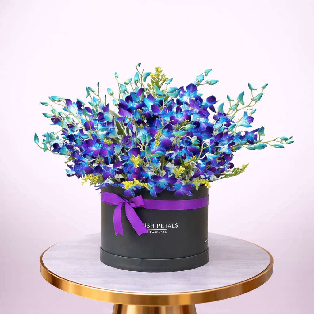 Celebrate the joy of a baby boy’s arrival with our Oh Boy flower box, featuring 40 stunning blue orchids complemented by cheerful yellow solidago. This vibrant and unique arrangement is a bold twist on traditional new baby blooms, making it a perfect gift for baby showers, hospital visits, or welcome-home celebrations in Dubai.