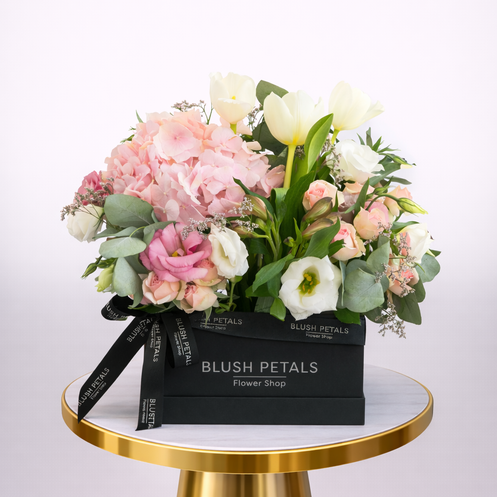 elebrate life’s happiest milestones with our Best Wishes Box, featuring lush pink hydrangeas, elegant white tulips, delicate lisianthus, vibrant alstroemeria, and soft limonium. Fresh eucalyptus adds a natural touch, enhancing the beauty and fragrance of this exquisite arrangement. Presented in our signature black gift box, it’s perfect for sending congratulations for graduations, promotions, weddings, or any joyous occasion. Handcrafted by expert florists and available for same-day delivery in Dubai.