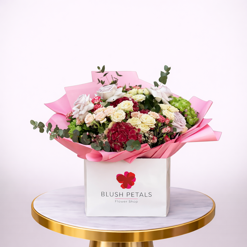 Express your deepest love with Blooming Affection – an enchanting anniversary bouquet featuring creamy white roses, blush spray roses, rich burgundy hydrangeas, and fresh green blooms, perfectly accented with eucalyptus. Arranged in our signature Blush Petals bag and wrapped in soft pink elegance, this bouquet radiates romance and sophistication. Handcrafted in Dubai, it’s the perfect way to say “I love you” and create memories that last forever.