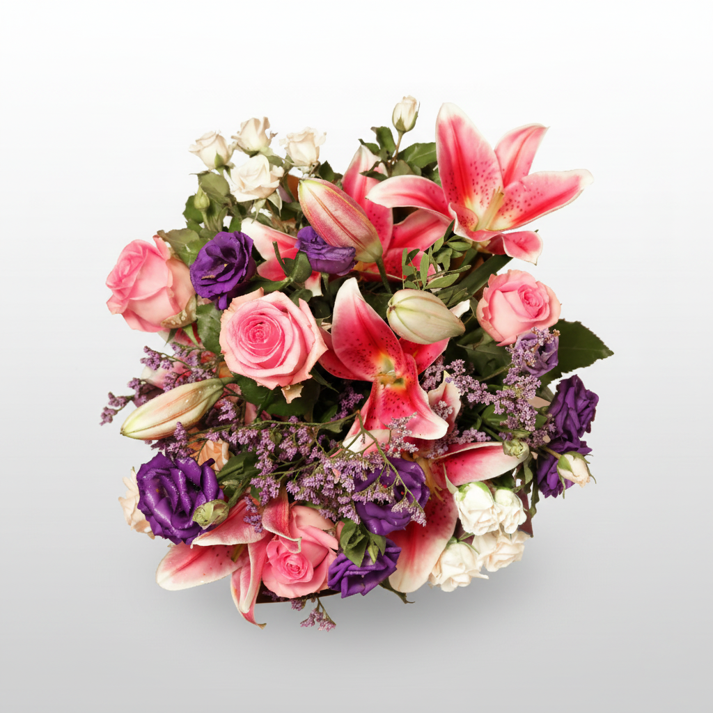 Mark life’s proudest moments with Color Bloom, a joyful congratulatory bouquet designed to impress. Featuring radiant pink lilies, charming pink roses, delicate baby white roses, and graceful lisianthus, accented with limonium and fresh pistacia, this vibrant arrangement is a true symbol of success and happiness. Handcrafted in Dubai, it’s the perfect gift to celebrate achievements, promotions, graduations, and more — with same-day delivery for your heartfelt wishes.