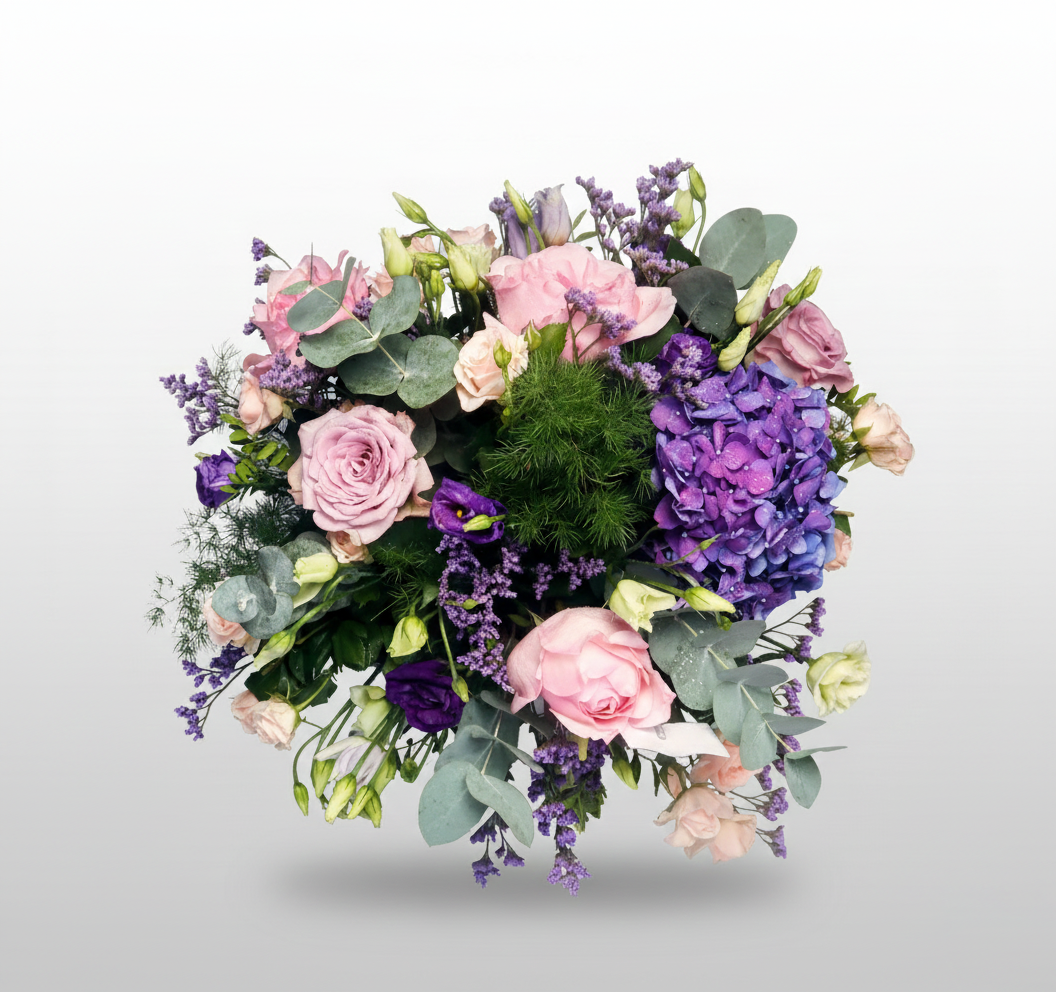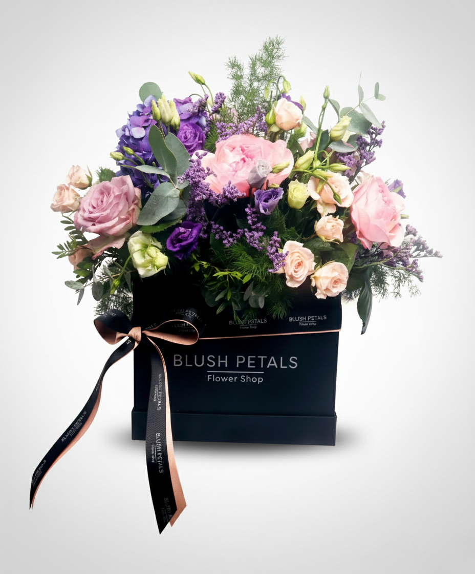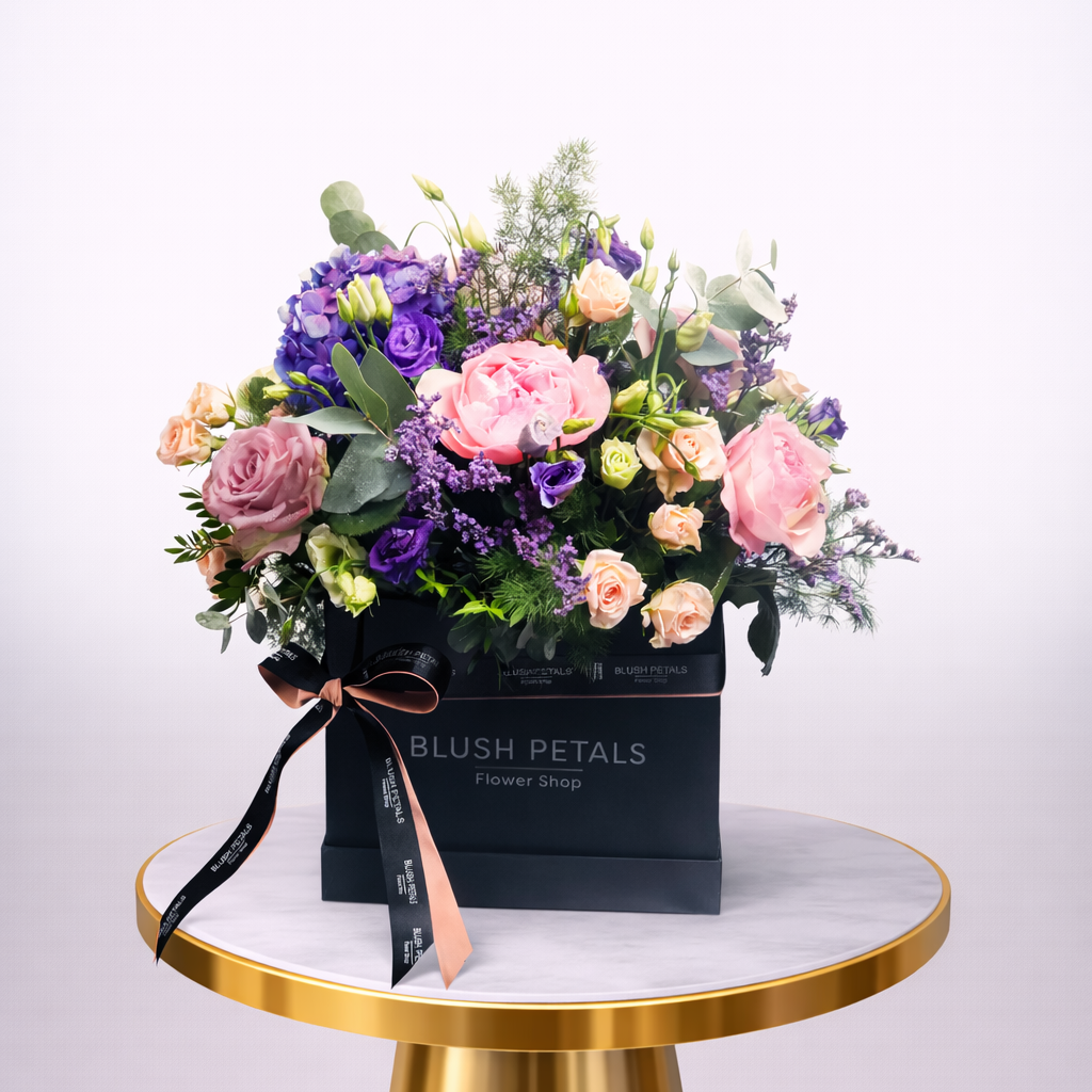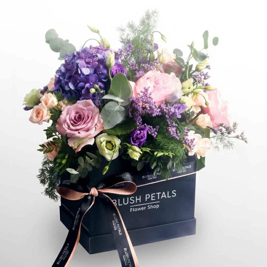 Celebrate in style with the exquisite Purple Rain Box — a vibrant blend of regal purple hydrangeas, romantic pink roses, and elegant purple roses. Accented with soft lisianthus, fresh eucalyptus, and delicate limonium, this hand-crafted arrangement is perfect for sending heartfelt congratulations. Designed by Blush Petals’ expert florists, it brings a burst of luxury and joy to any occasion. Same-day delivery available across Dubai