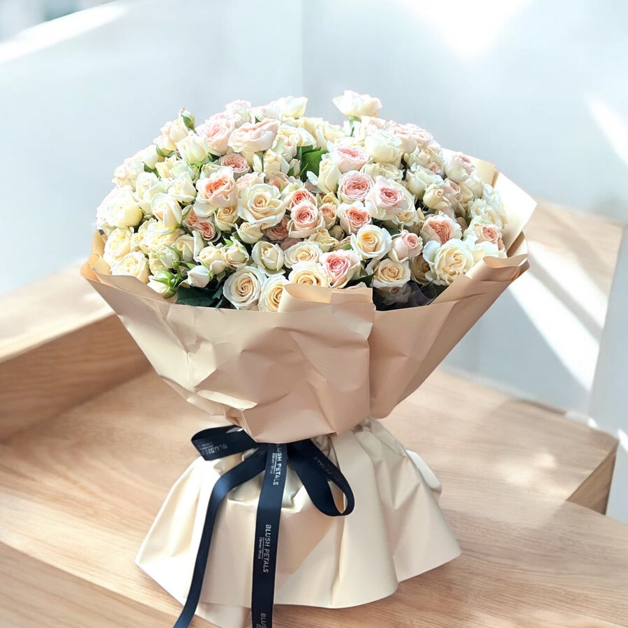 Soft, romantic, and timeless – our Serenity bouquet features 11 peach baby roses and 11 pink baby roses, beautifully hand-tied to create a delicate yet luxurious arrangement. Perfect for weddings, engagements, or anniversary celebrations, this pastel-toned bouquet symbolizes love, tenderness, and new beginnings. Elegantly wrapped with premium paper and ribbon, it’s an exquisite choice for the modern bride. Available for same-day wedding flower delivery in Dubai.