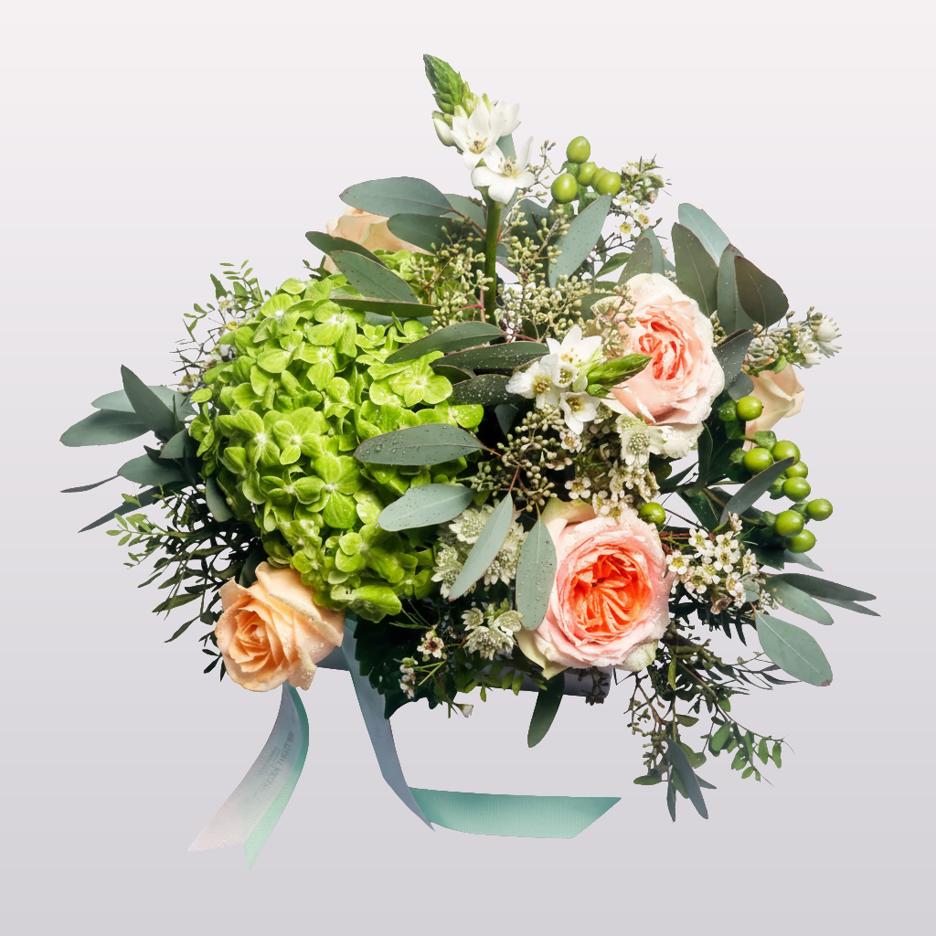 Express your care with our Thinking of You Box, a charming blend of lush green hydrangeas, elegant peach roses, delicate astrantia, and sprigs of veronica. Accented with fresh hypericum berries, pistacia, and eucalyptus, this arrangement is artfully displayed in a premium signature box with a soft ribbon finish. Perfect for sending warm thoughts, celebrating special moments, or simply brightening someone’s day. Available for same-day delivery in Dubai.