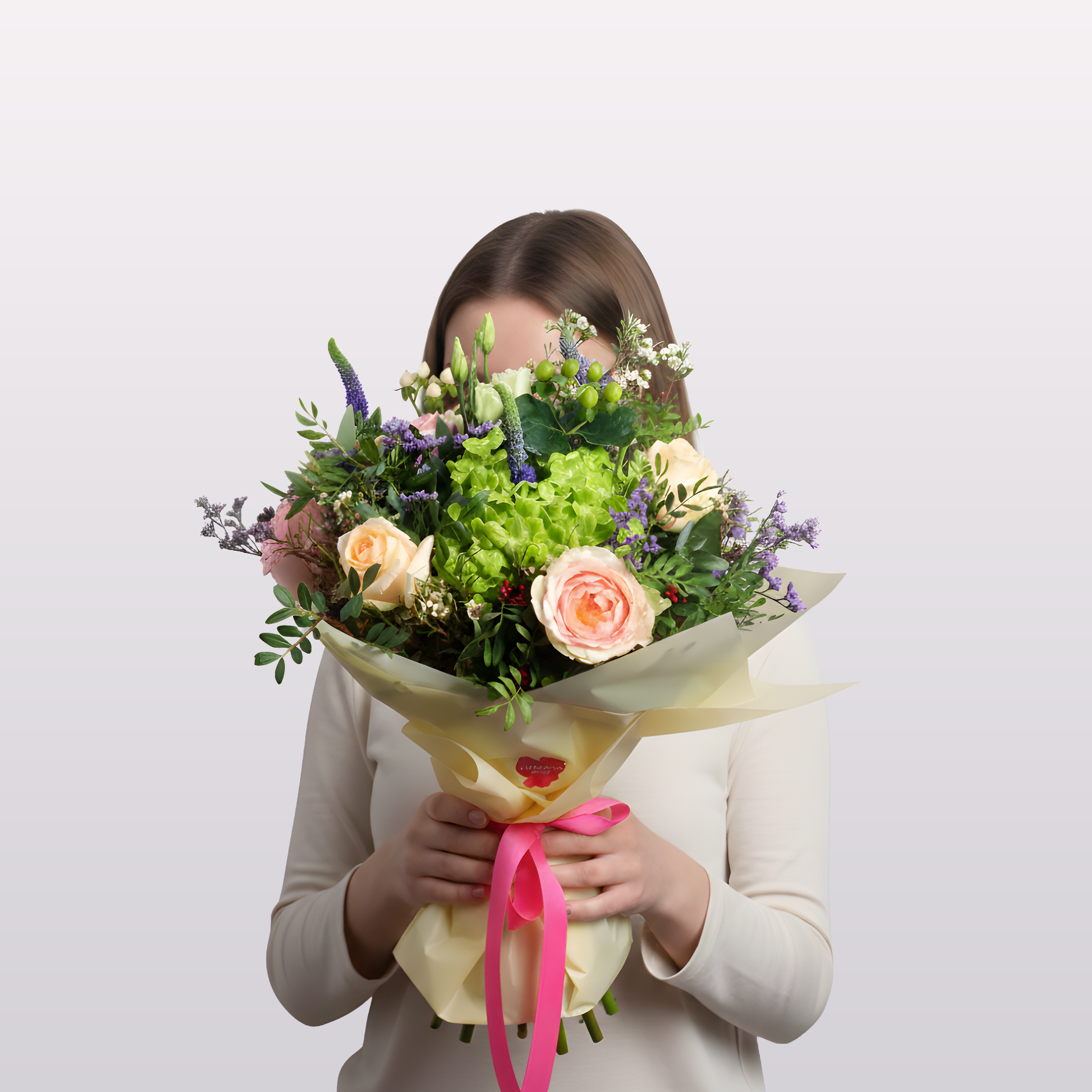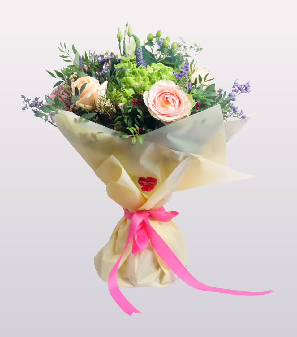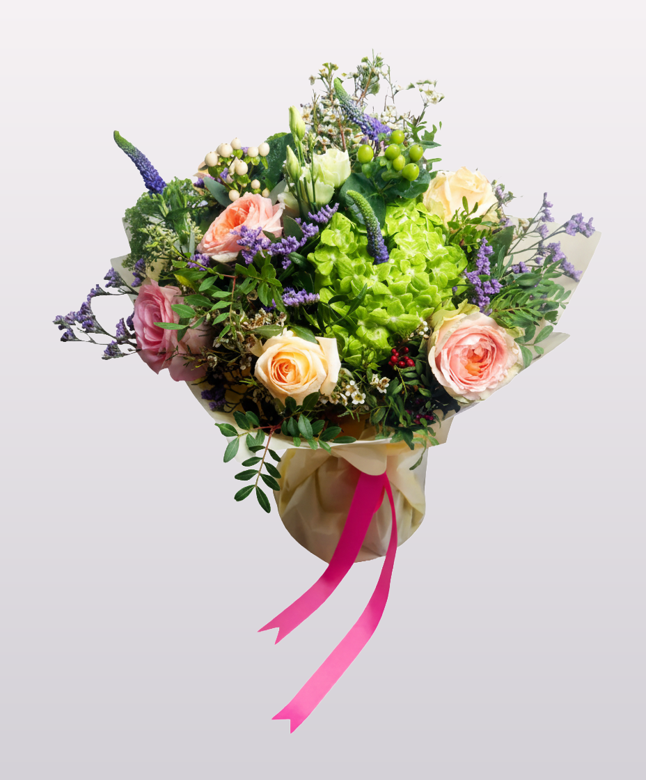 Send a timeless gesture of elegance with our Vintage Glam bouquet – a graceful mix of lush green hydrangeas, romantic pink and peach roses, fresh veronica, and green chrysanthemums. Accented with hypericum berries, limonium, and pistacia foliage, this hand-tied arrangement is wrapped in soft pastel paper and finished with a vibrant ribbon. Perfect for Thinking of You, anniversaries, or any occasion that calls for beauty and charm. Available for same-day delivery in Dubai.