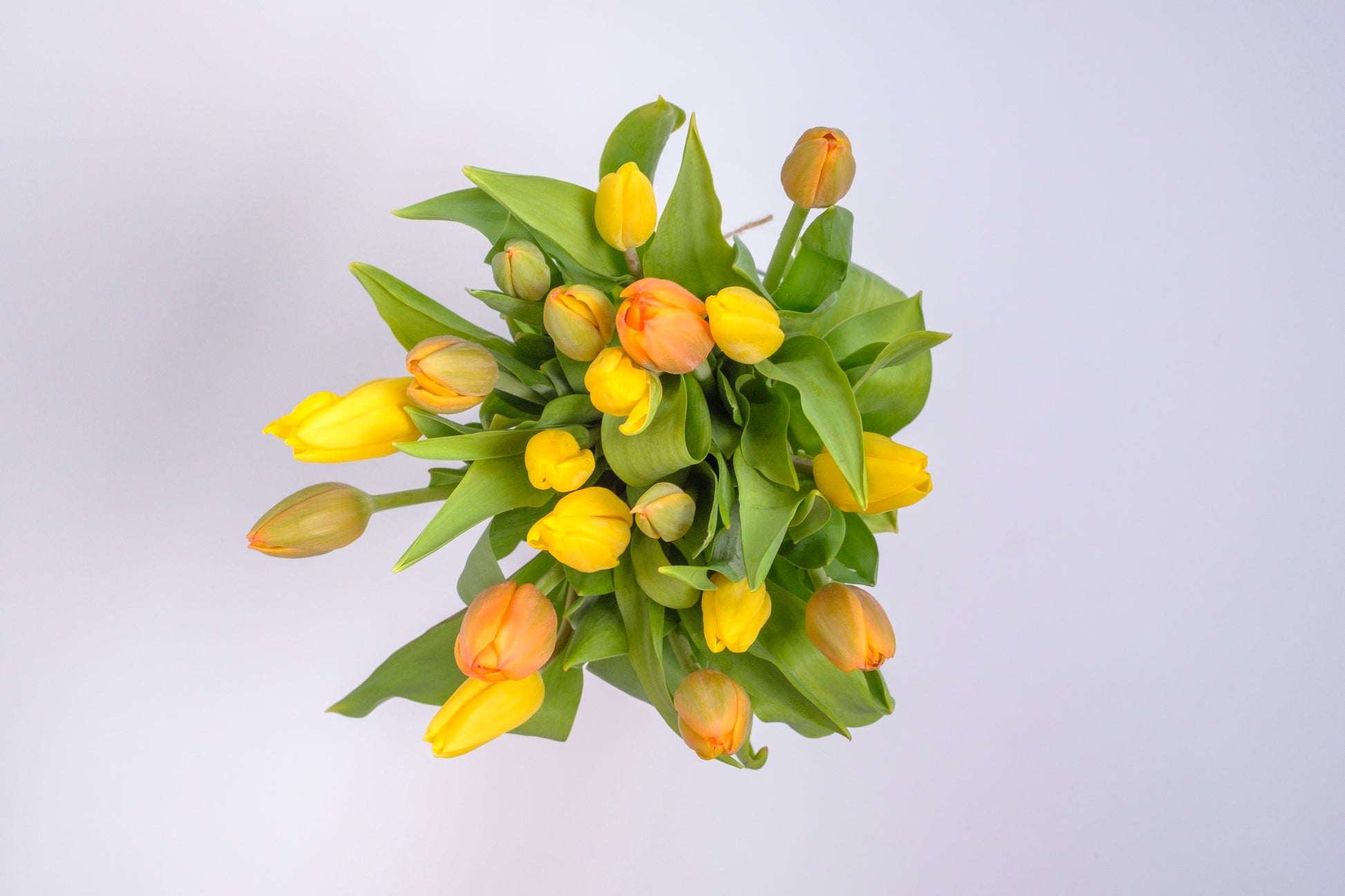 Radiating warmth and joy, "Golden Whispers" is a bright bouquet of cheerful yellow and soft orange tulips, hand-tied with lush green leaves. This arrangement is perfect for celebrations, thank-you gifts, or to bring a touch of sunshine to someone's day. The tulips symbolize happiness, new beginnings, and sincere wishes — making this the perfect floral gesture when words fall short.