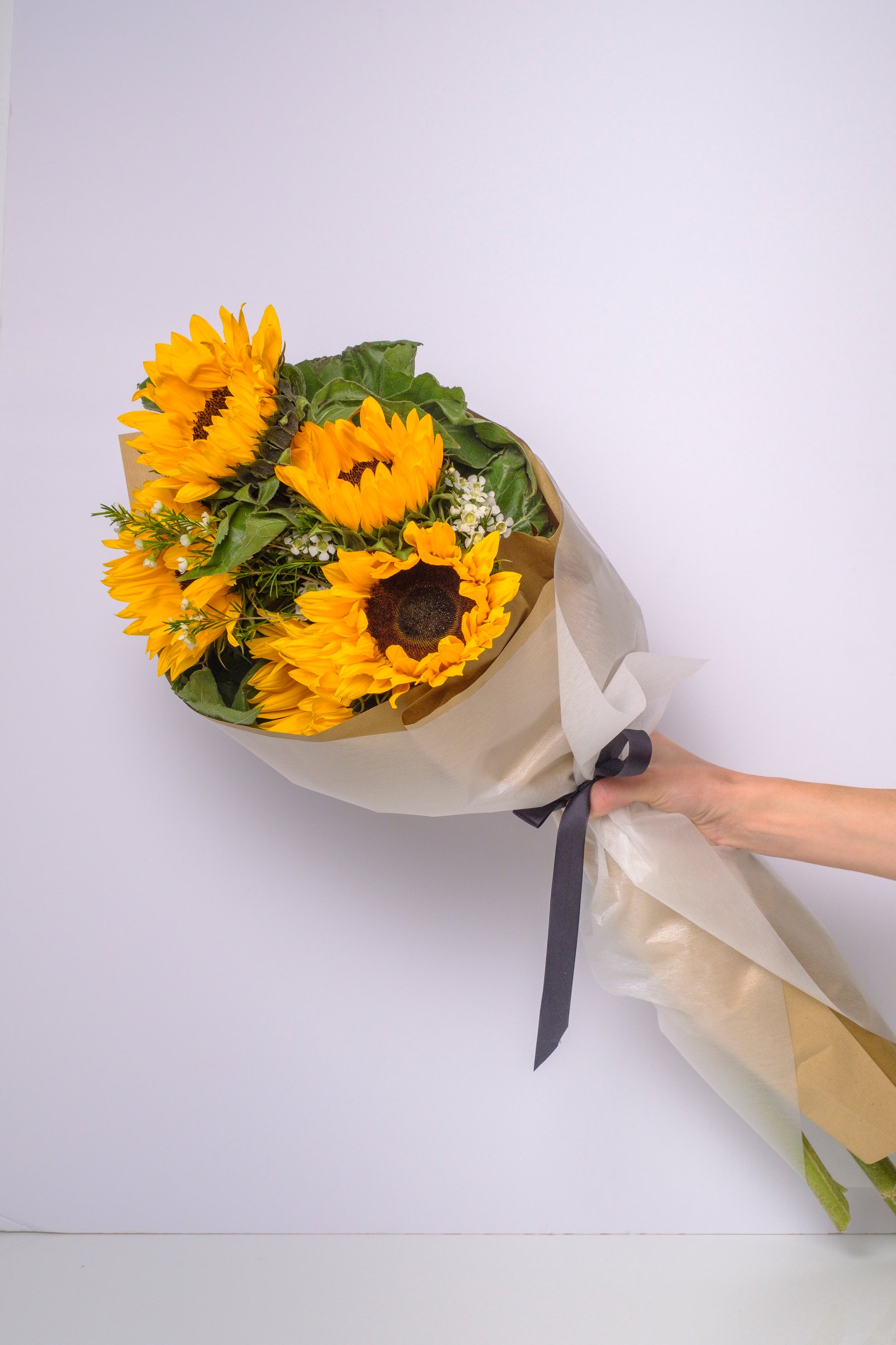 Wrapped in soft beige paper and tied with a contrasting black ribbon, this bouquet exudes elegance and joy. Each bloom beams with golden brilliance—bringing smiles with every glance.
