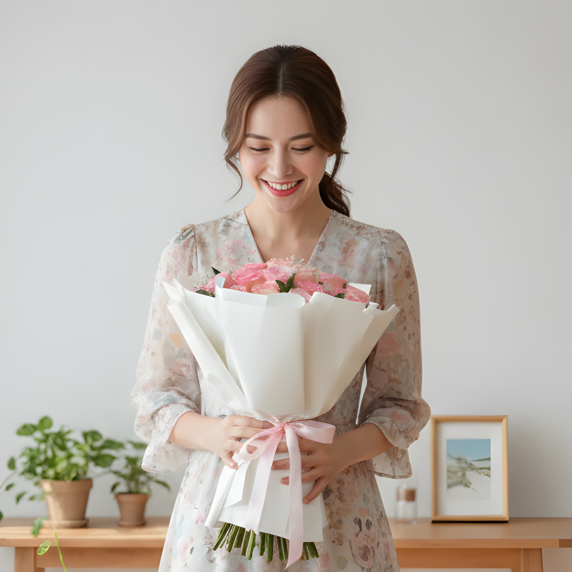 Radiating pure elegance, our Rose Quartz bouquet features 40 premium pink roses paired with delicate gypsophila for a soft, romantic touch. Wrapped in pristine white with a blush satin ribbon, this luxurious arrangement is the perfect gift for anniversaries, birthdays, weddings, or any heartfelt celebration in Dubai. Each bloom is carefully selected for freshness and beauty, making this bouquet a timeless expression of love and admiration.