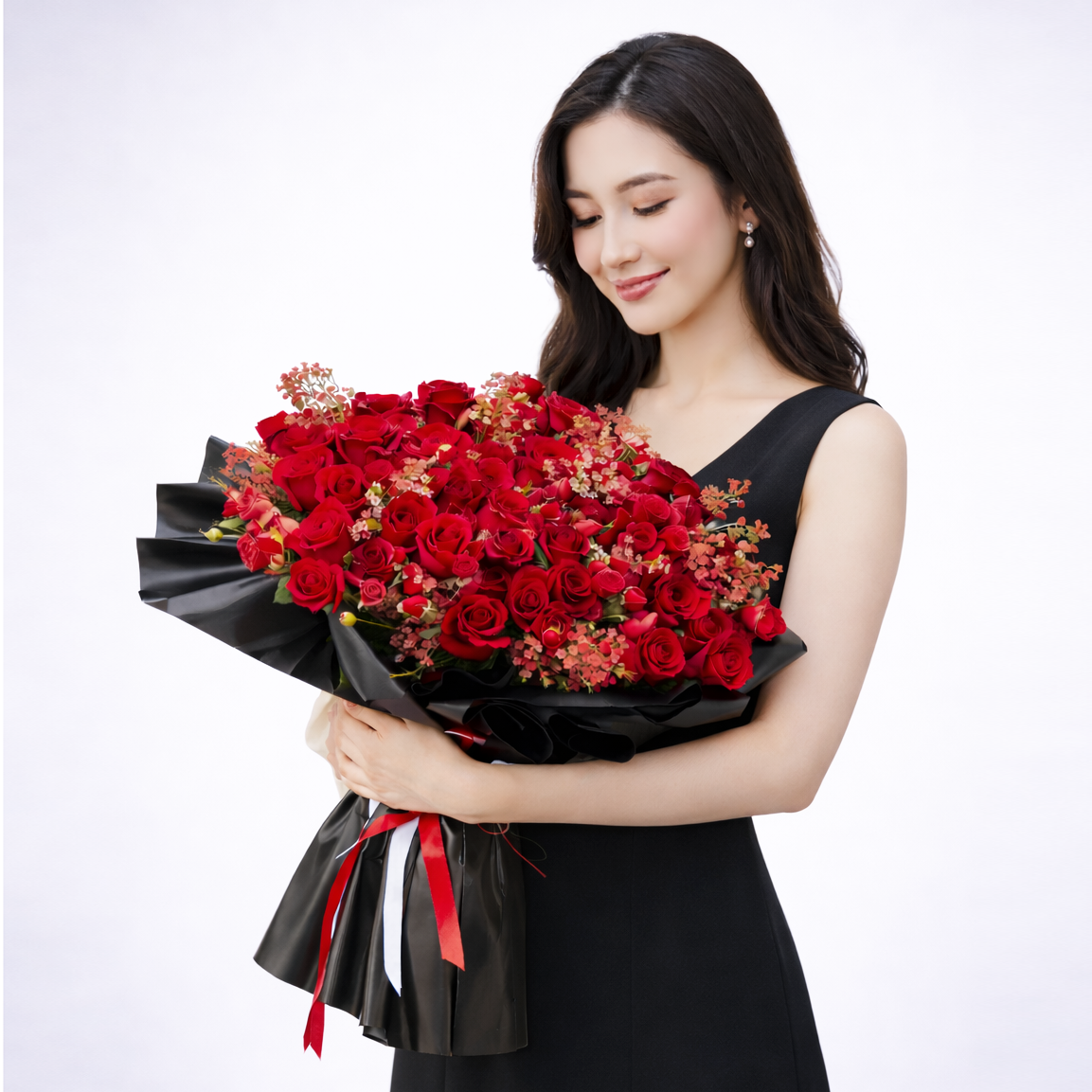 Give her the gift every woman dreams of with our “Lucky Girl Bouquet”. This breathtaking Valentine’s arrangement is crafted with 70 luxurious red roses, 20 delicate red baby roses, and 10 sprigs of wax flowers, elegantly hand-tied in premium wrapping. A grand and romantic gesture, this bouquet symbolizes passion, admiration, and love that knows no bounds. Perfect for Valentine’s Day, anniversaries, or a surprise that will leave her feeling truly special, this bouquet is delivered fresh across Dubai.