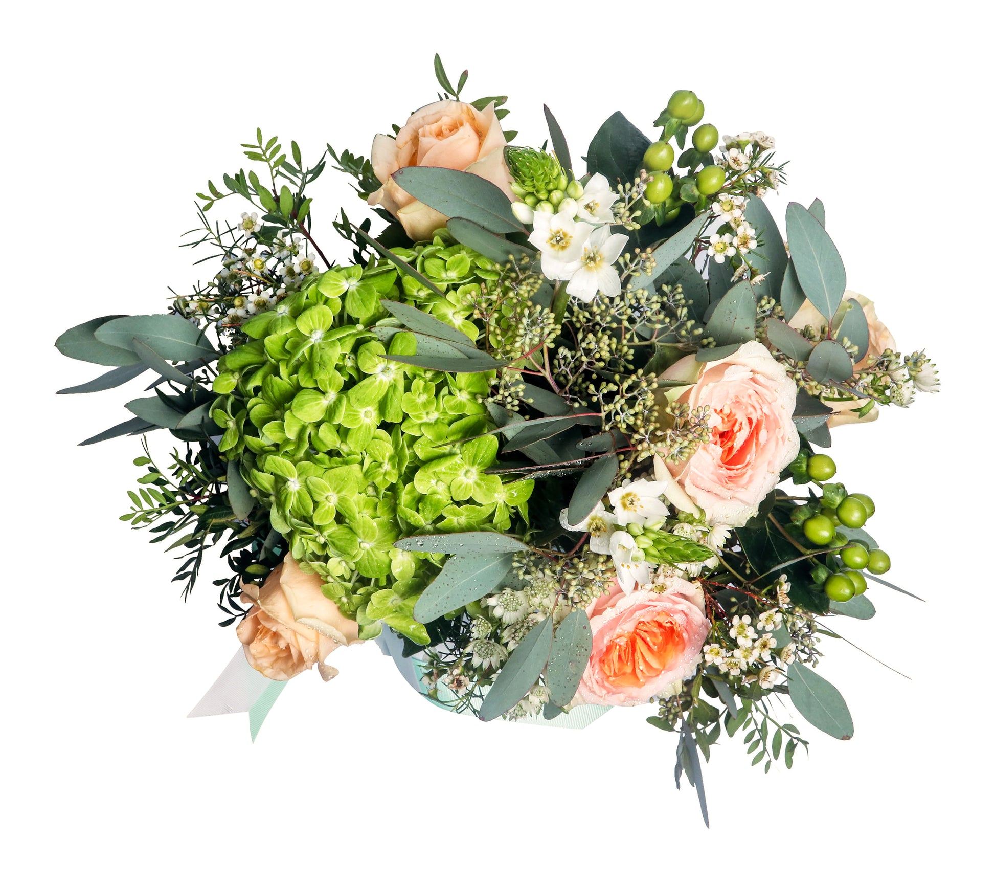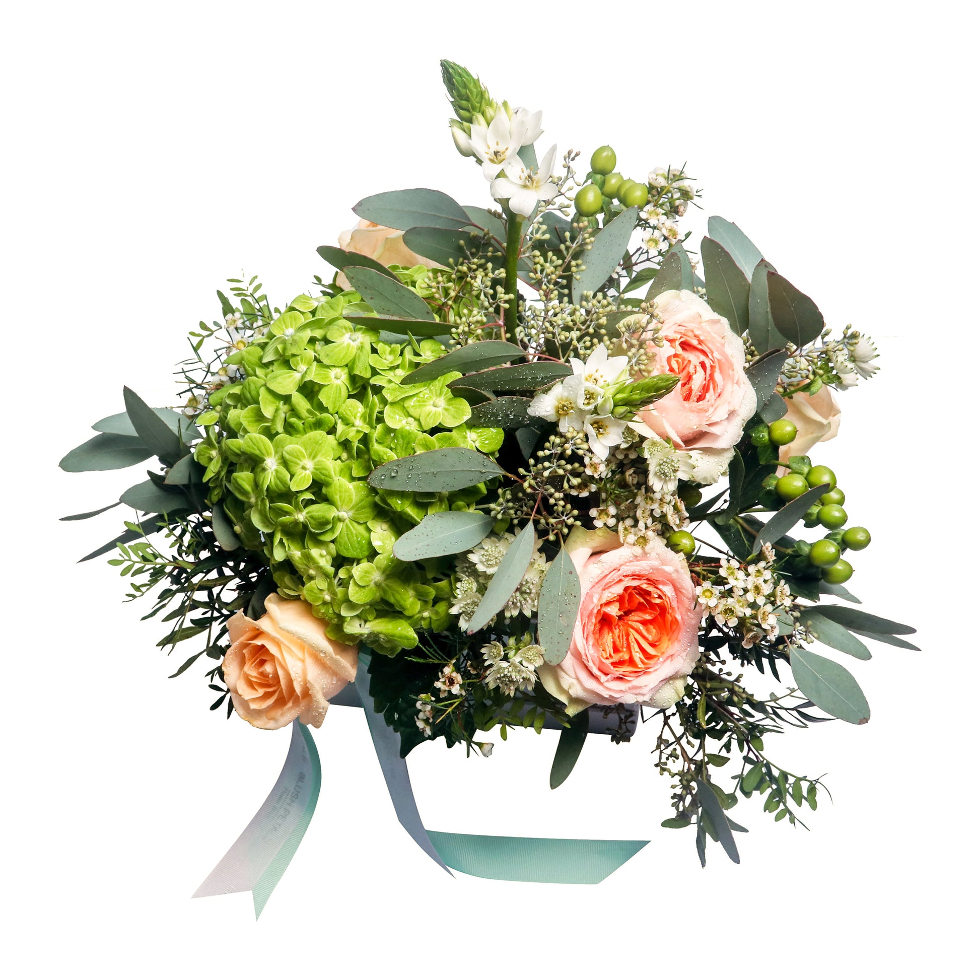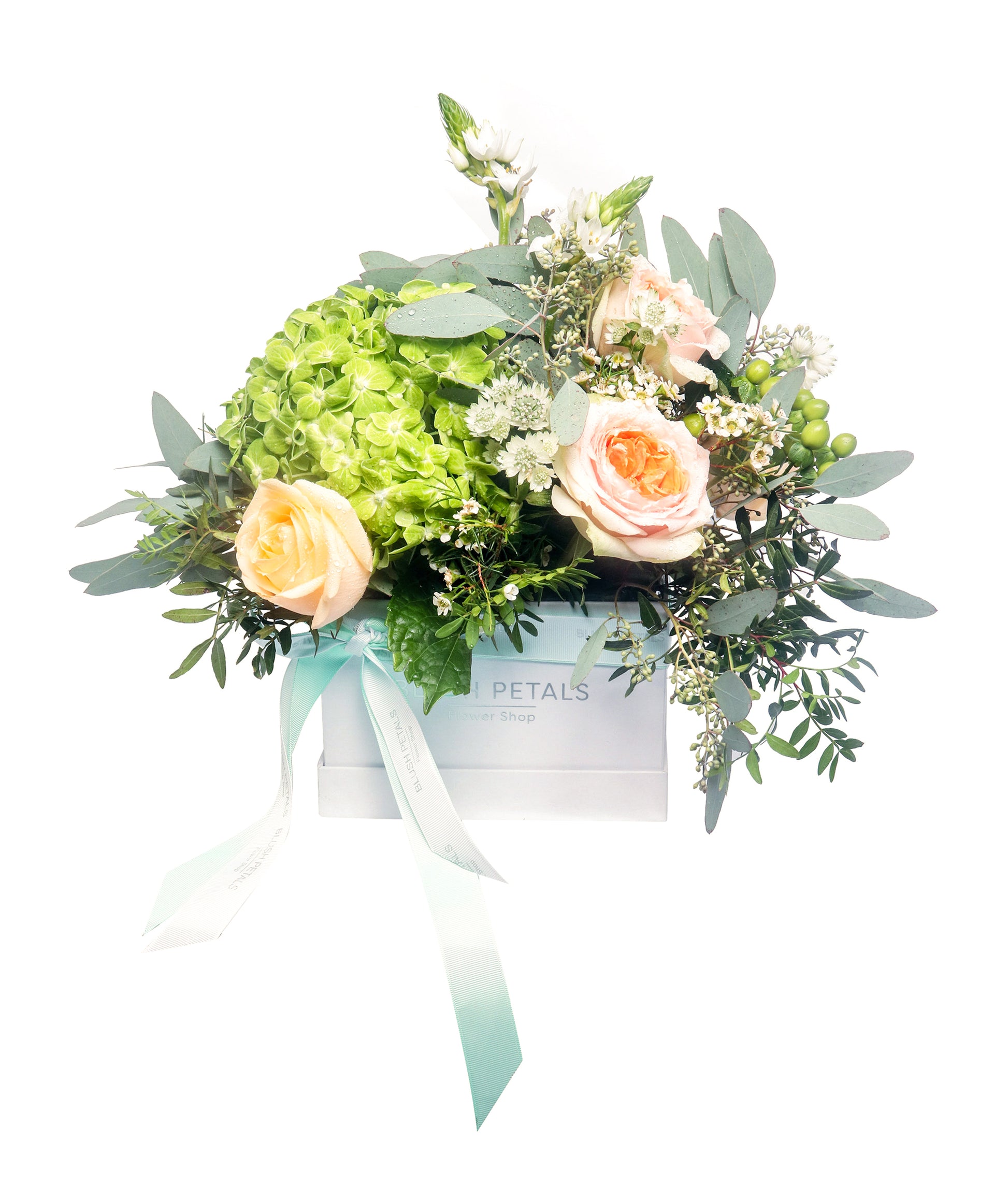 Express your care with our Thinking of You Box, a charming blend of lush green hydrangeas, elegant peach roses, delicate astrantia, and sprigs of veronica. Accented with fresh hypericum berries, pistacia, and eucalyptus, this arrangement is artfully displayed in a premium signature box with a soft ribbon finish. Perfect for sending warm thoughts, celebrating special moments, or simply brightening someone’s day. Available for same-day delivery in Dubai.