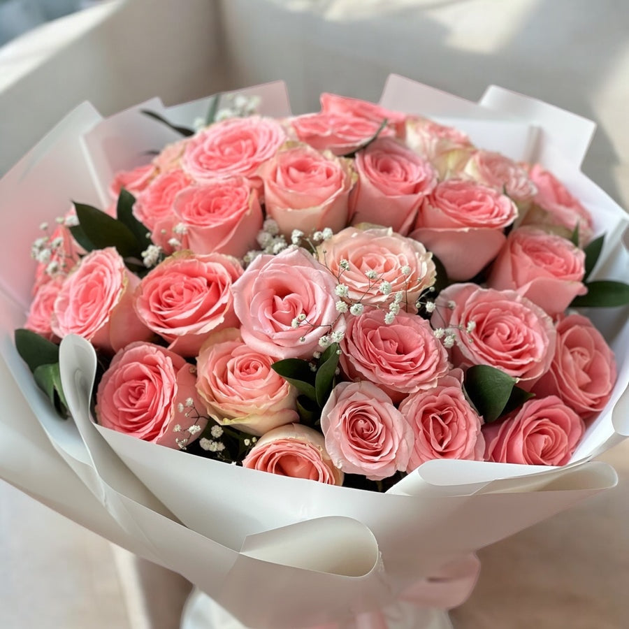 Radiating pure elegance, our Rose Quartz bouquet features 40 premium pink roses paired with delicate gypsophila for a soft, romantic touch. Wrapped in pristine white with a blush satin ribbon, this luxurious arrangement is the perfect gift for anniversaries, birthdays, weddings, or any heartfelt celebration in Dubai. Each bloom is carefully selected for freshness and beauty, making this bouquet a timeless expression of love and admiration.