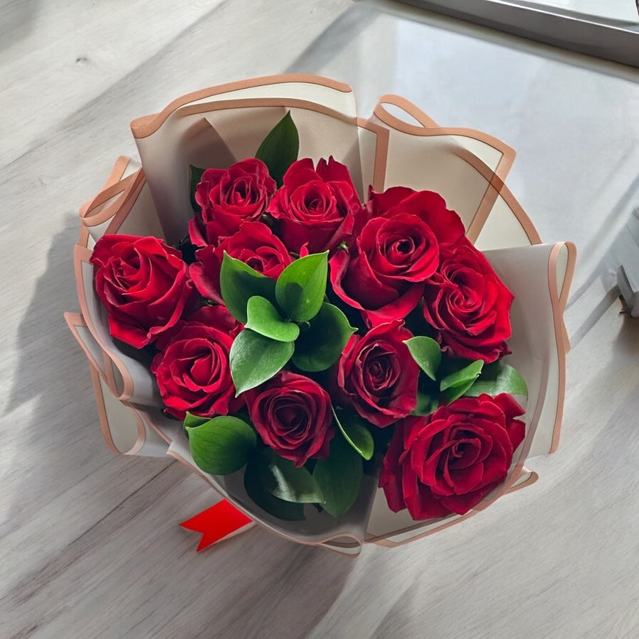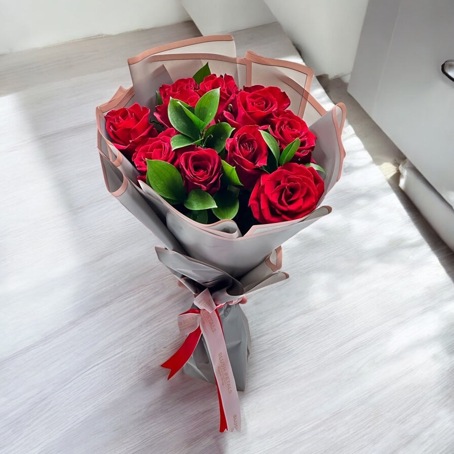 Simple yet striking, our Small Kisses bouquet features 10 velvety red roses accented with lush greenery, wrapped in chic grey and blush tones for a modern, elegant finish. Perfect for anniversaries, romantic gestures, birthdays, or “just because” surprises in Dubai, this bouquet speaks volumes without saying a word. Hand-selected for freshness and beauty, it’s the ideal gift for making any moment unforgettable.