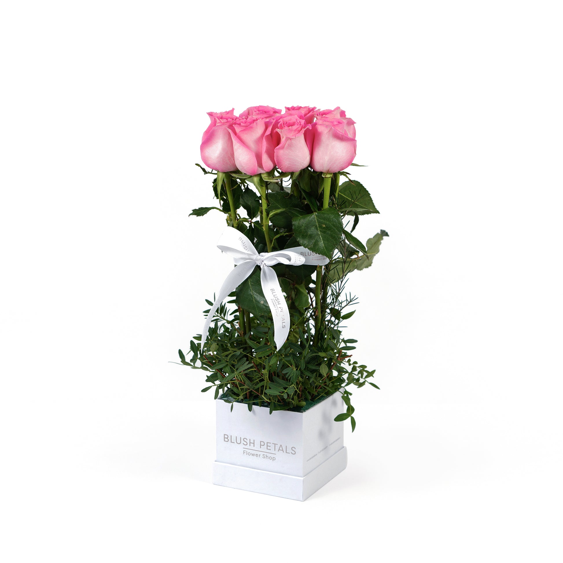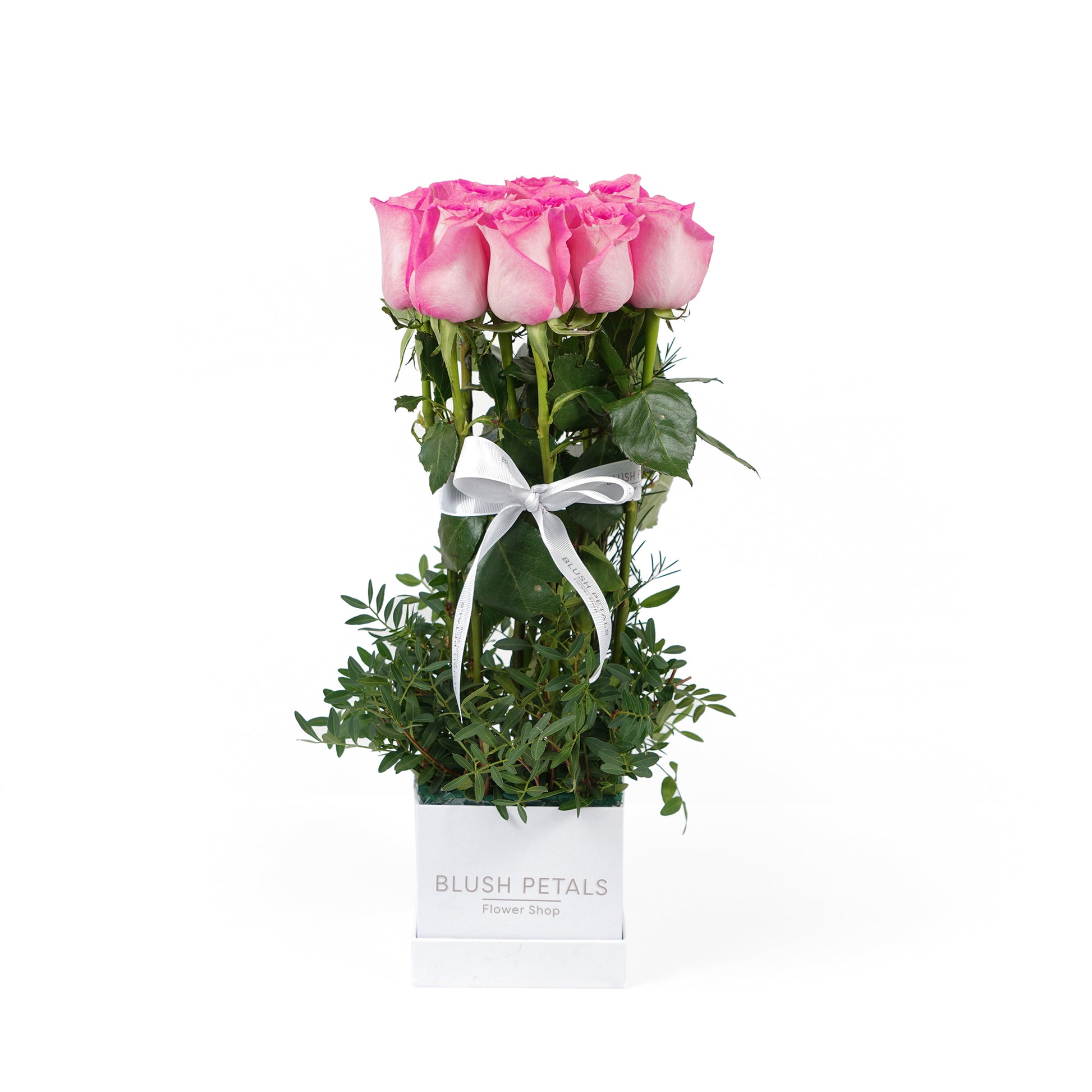 Delicate yet refined, our Soft Pink Elegance arrangement showcases 10 premium pink roses beautifully paired with lush pistacia greenery. Presented in a tall vertical design within a sleek white box and finished with a satin ribbon, this floral piece blends modern sophistication with timeless romance. Perfect for anniversaries, birthdays, corporate gifting, or heartfelt occasions in Dubai, each bloom is hand-selected for freshness, making it a truly graceful gift.
