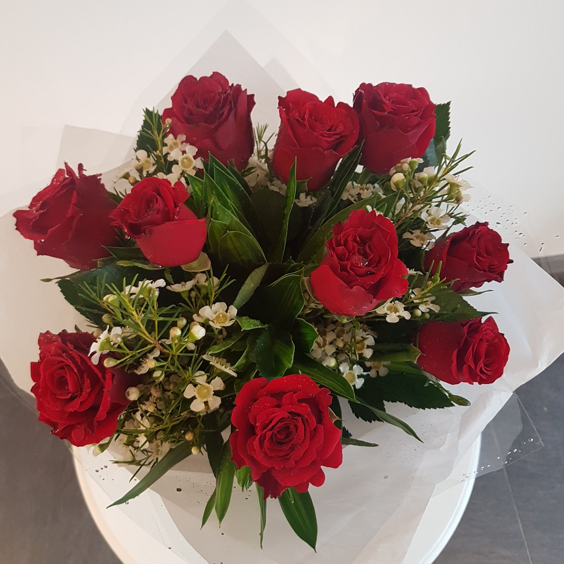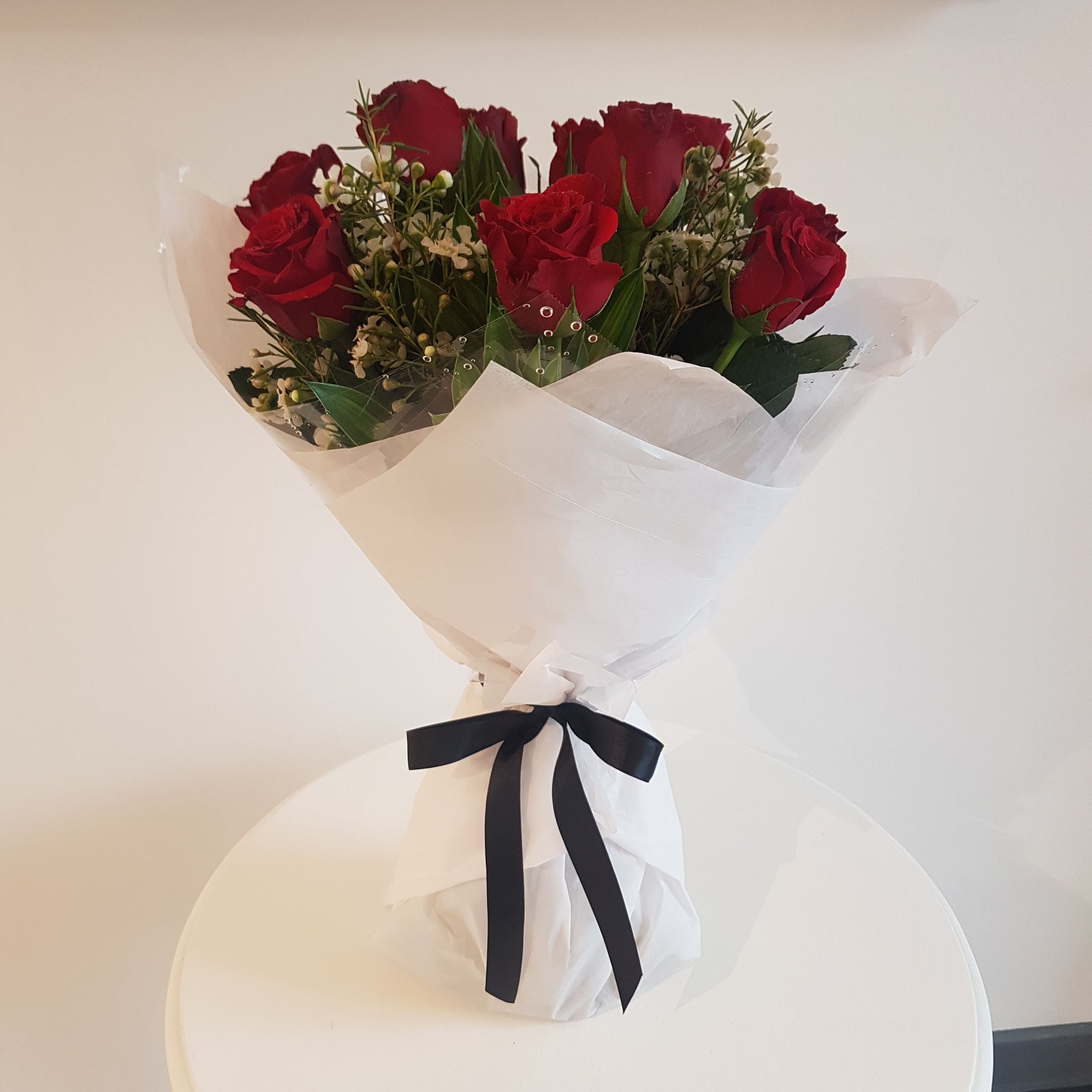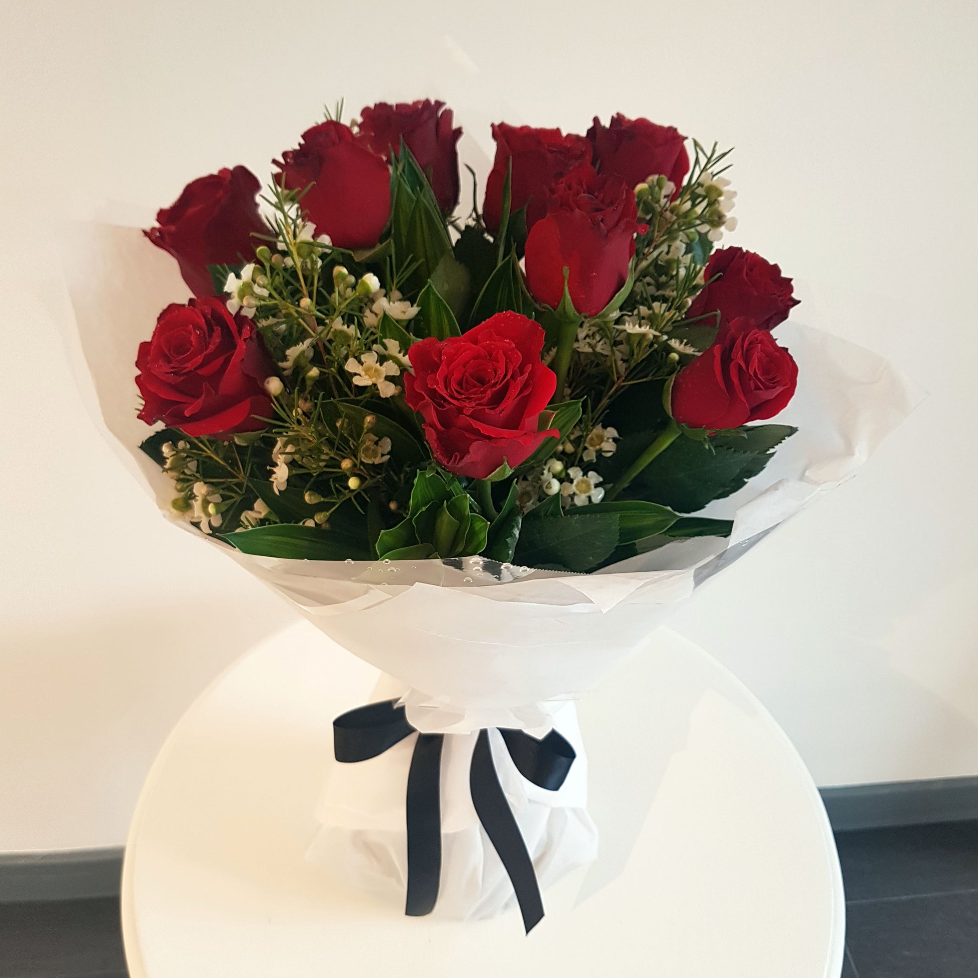 Stylish and timeless, our Tuxedo bouquet features 10 velvety red roses accented with delicate white wax flowers and lush greenery. Wrapped in crisp white paper with a sleek black ribbon, this arrangement exudes sophistication and charm — perfect for romantic gestures, anniversaries, graduations, or any elegant occasion in Dubai. Each bloom is carefully chosen for its freshness and beauty, making it an unforgettable gift for someone special.