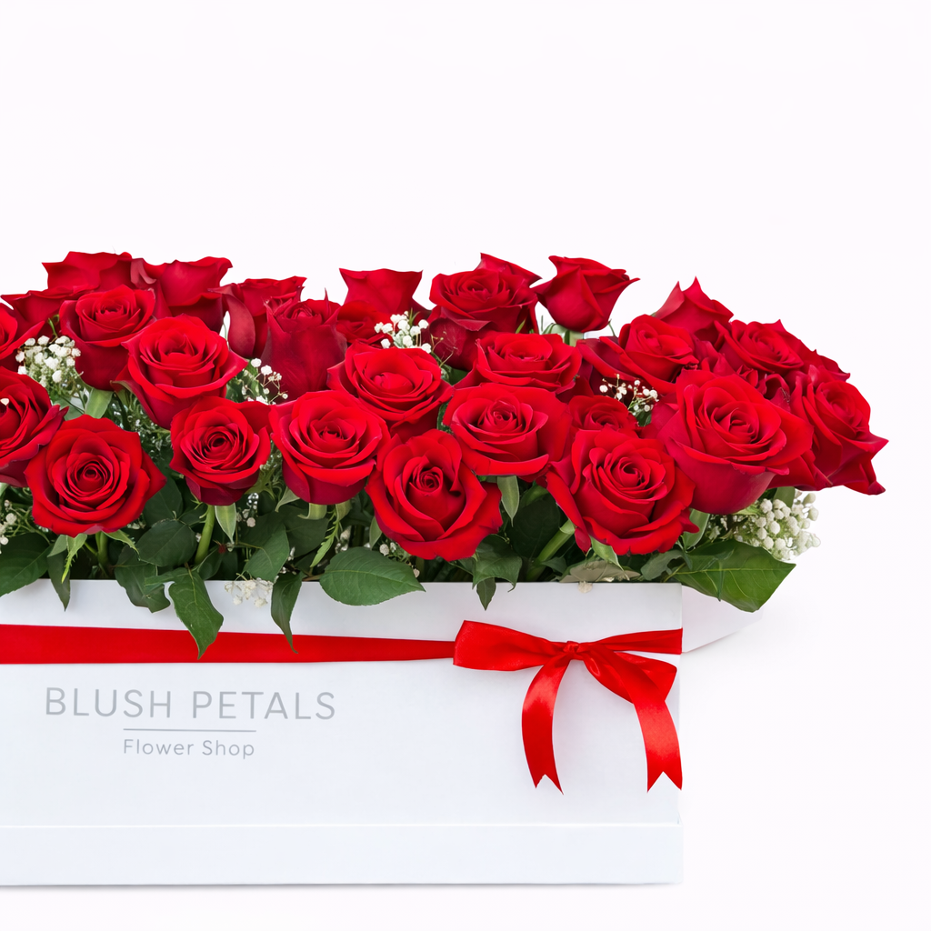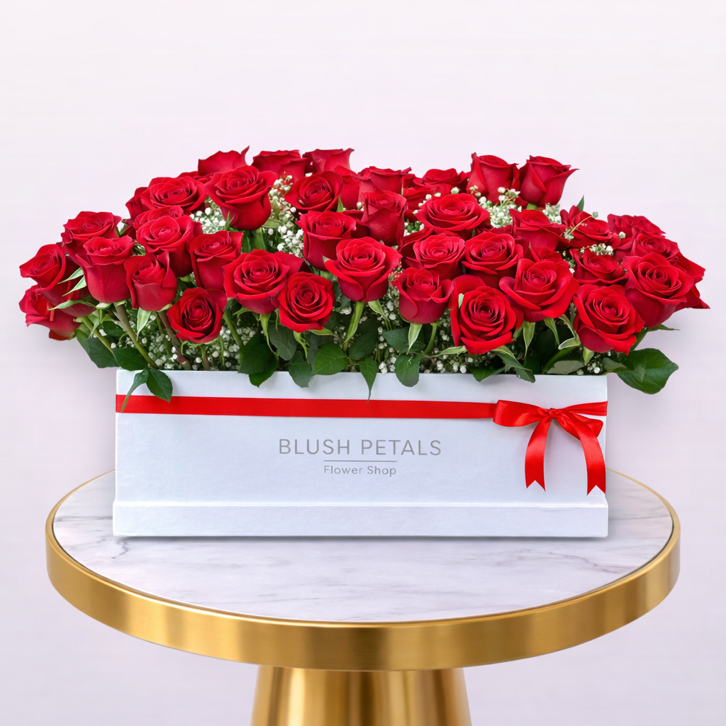 Show your love in the grandest way with our “Big Hug Box”. Overflowing with 60 luxurious red roses and accented with delicate gypsophila, this breathtaking arrangement is the ultimate Valentine’s gift. Beautifully presented in an elegant signature box with a satin ribbon, it embodies romance, passion, and devotion. Perfect for Valentine’s Day, anniversaries, or when words are not enough, this flower box is guaranteed to leave a lasting impression.