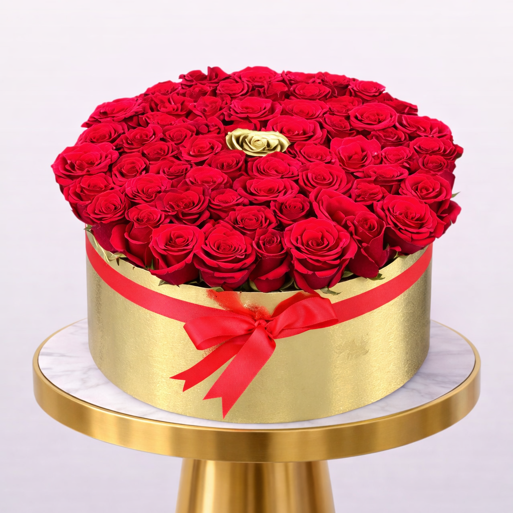 Turn any moment into a grand romantic gesture with Passion Struck. Featuring 72 premium long-stem red roses, elegantly arranged in a luxurious gold box and accented with a single golden rose at the center, this masterpiece speaks volumes of love, passion, and devotion. Perfect for anniversaries, Valentine’s Day, or the ultimate surprise, this lavish floral arrangement is the epitome of elegance and romance, delivered fresh anywhere in Dubai.