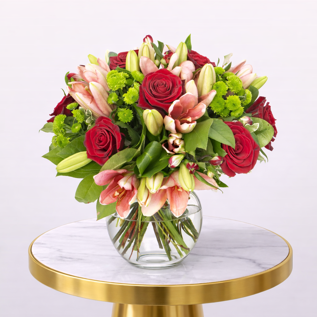 Ignite passion with Blush Love, a romantic glass vase arrangement featuring velvety red roses, charming red spray roses, and delicate alstroemeria. Accented with exotic white Asiatic lilies and vibrant barbathus, this bouquet exudes elegance and warmth. Perfect for anniversaries, proposals, or just to say “I love you,” this arrangement is a timeless expression of love, handcrafted fresh in Dubai.
