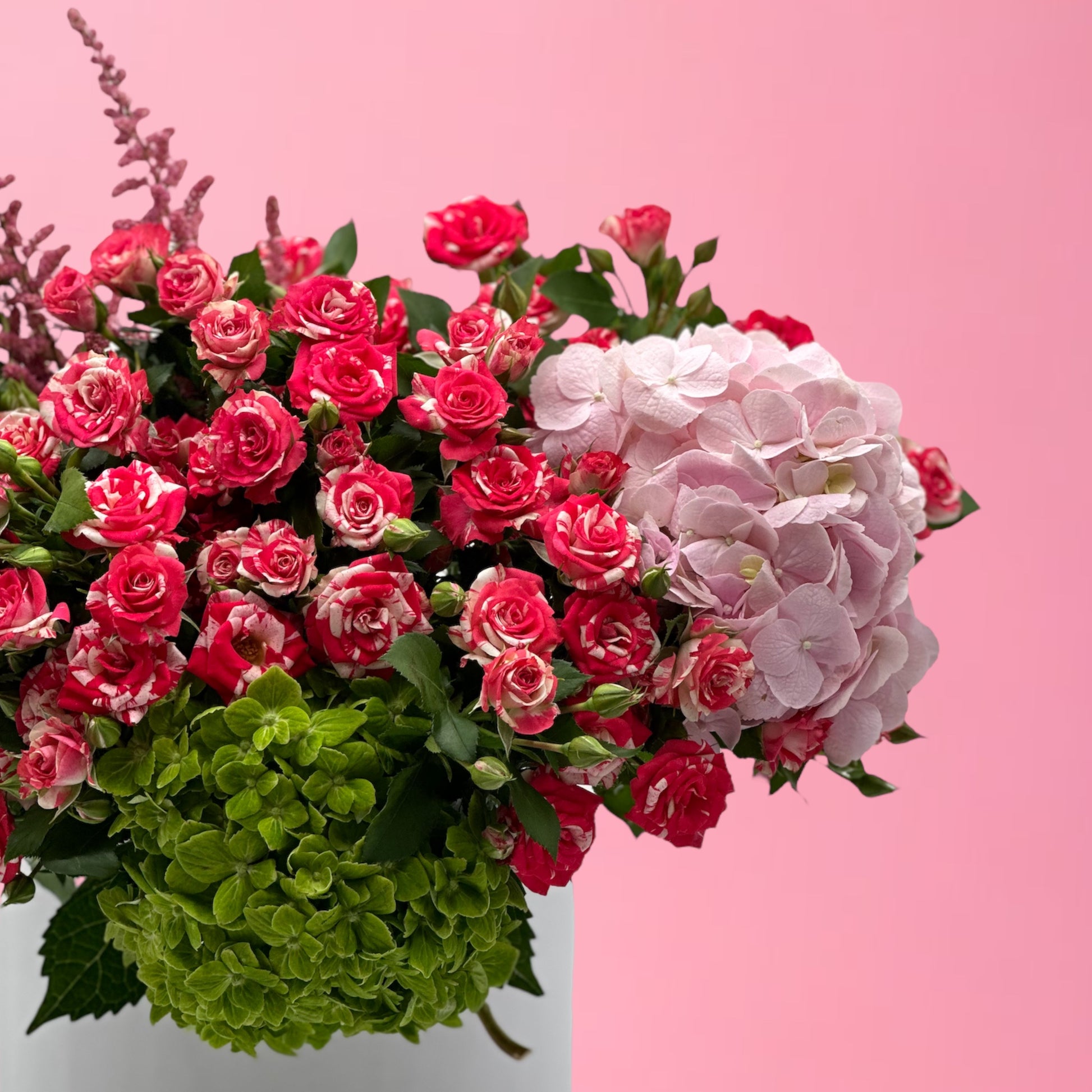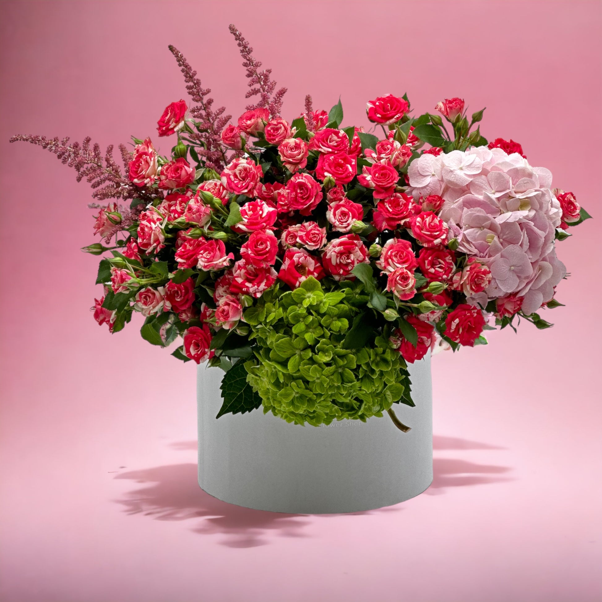 Celebrate in vibrant style with Flamingo, a joyful hatbox arrangement featuring 10 striking fuchsia baby roses, 1 lush green hydrangea, 1 delicate pink hydrangea, 3 soft pink baby roses, 3 elegant veronica stems, and 6 sprigs of fresh greenery. This colorful blend symbolizes happiness, love, and celebration – making it the perfect birthday gift. Expertly arranged in a premium hatbox, Flamingo delivers tropical elegance and cheerful vibes with same-day delivery across Dubai.