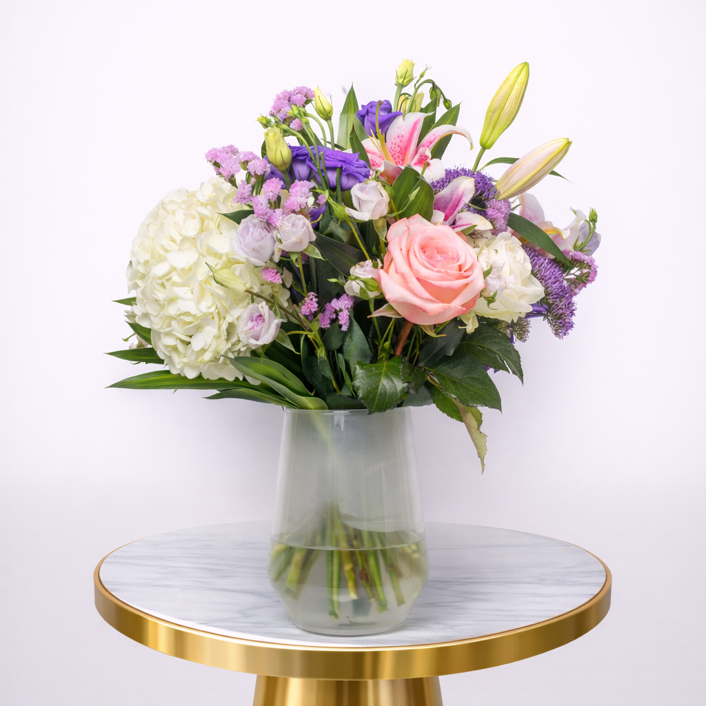 Celebrate Mother’s Day with the elegance of Spring Whisper, a radiant vase arrangement that captures the freshness of spring. Designed with lush hydrangeas, cheerful yellow roses, vibrant gerbera daisies, delicate statice, hypericum berries, alstroemeria, and fresh greenery, this bouquet is styled in a chic glass vase. The Spring Whisper is a heartfelt floral gift that expresses gratitude, love, and admiration while bringing warmth and joy to her special day