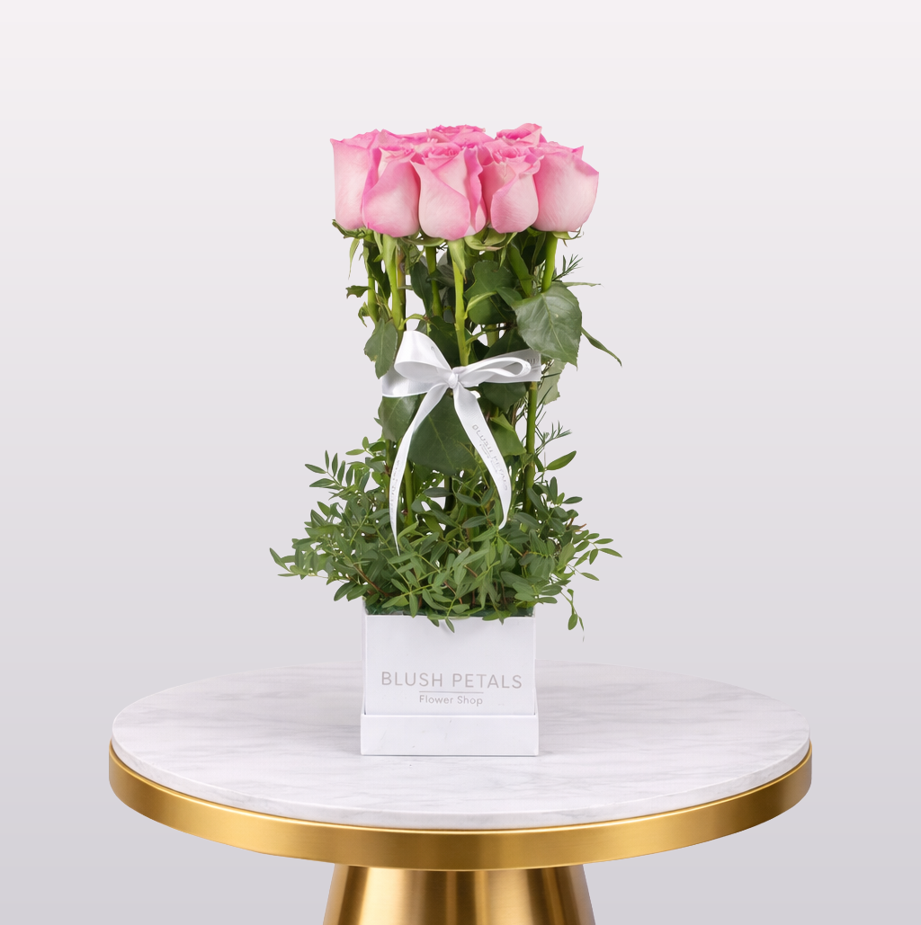 Delicate yet refined, our Soft Pink Elegance arrangement showcases 10 premium pink roses beautifully paired with lush pistacia greenery. Presented in a tall vertical design within a sleek white box and finished with a satin ribbon, this floral piece blends modern sophistication with timeless romance. Perfect for anniversaries, birthdays, corporate gifting, or heartfelt occasions in Dubai, each bloom is hand-selected for freshness, making it a truly graceful gift.