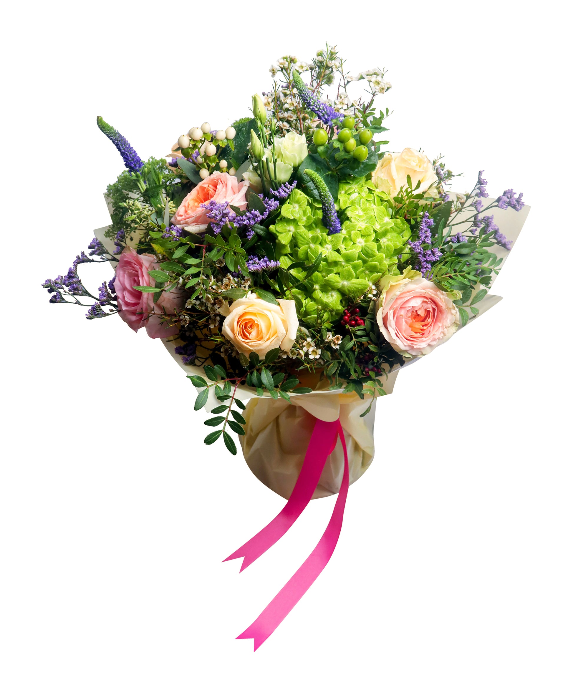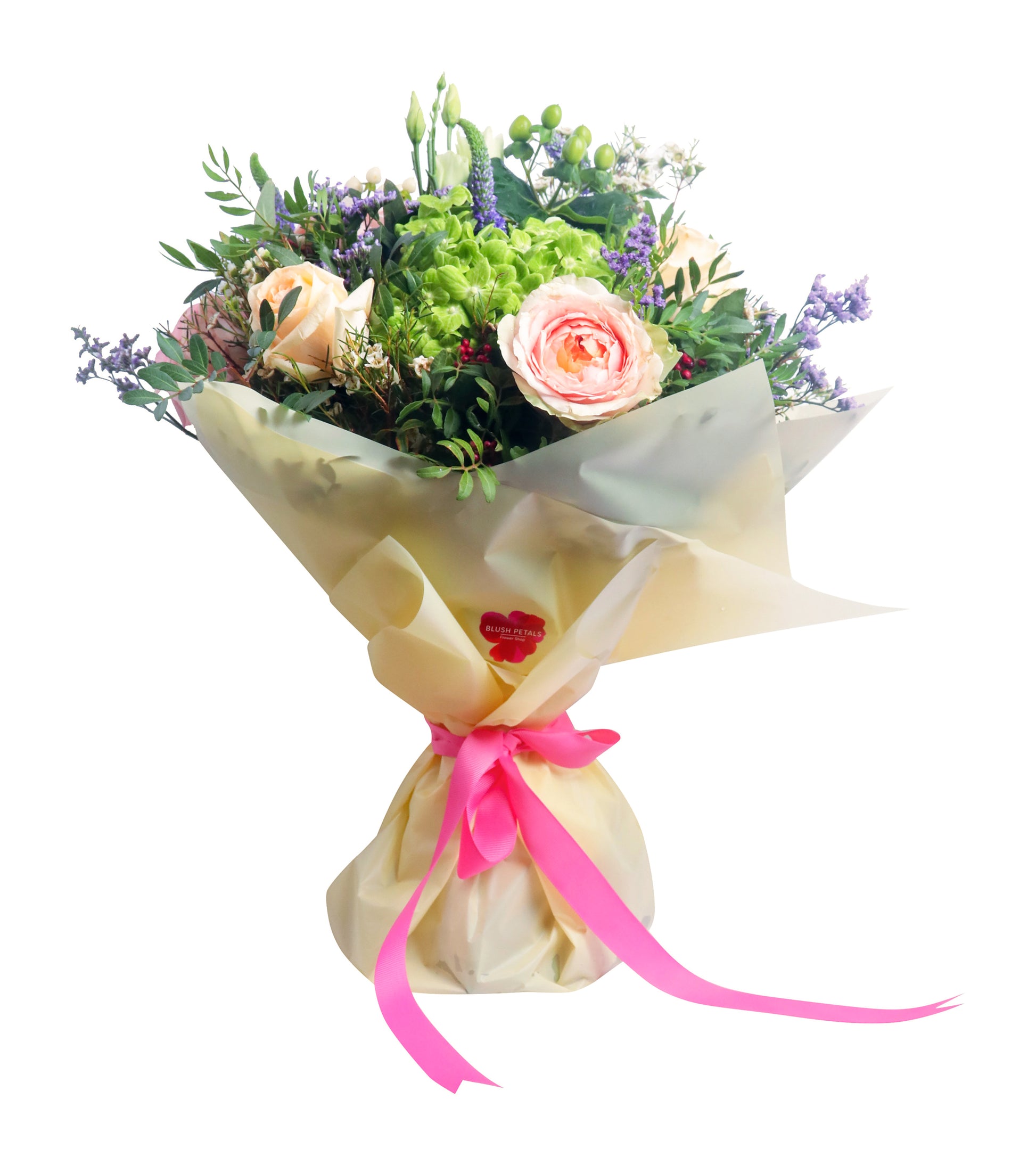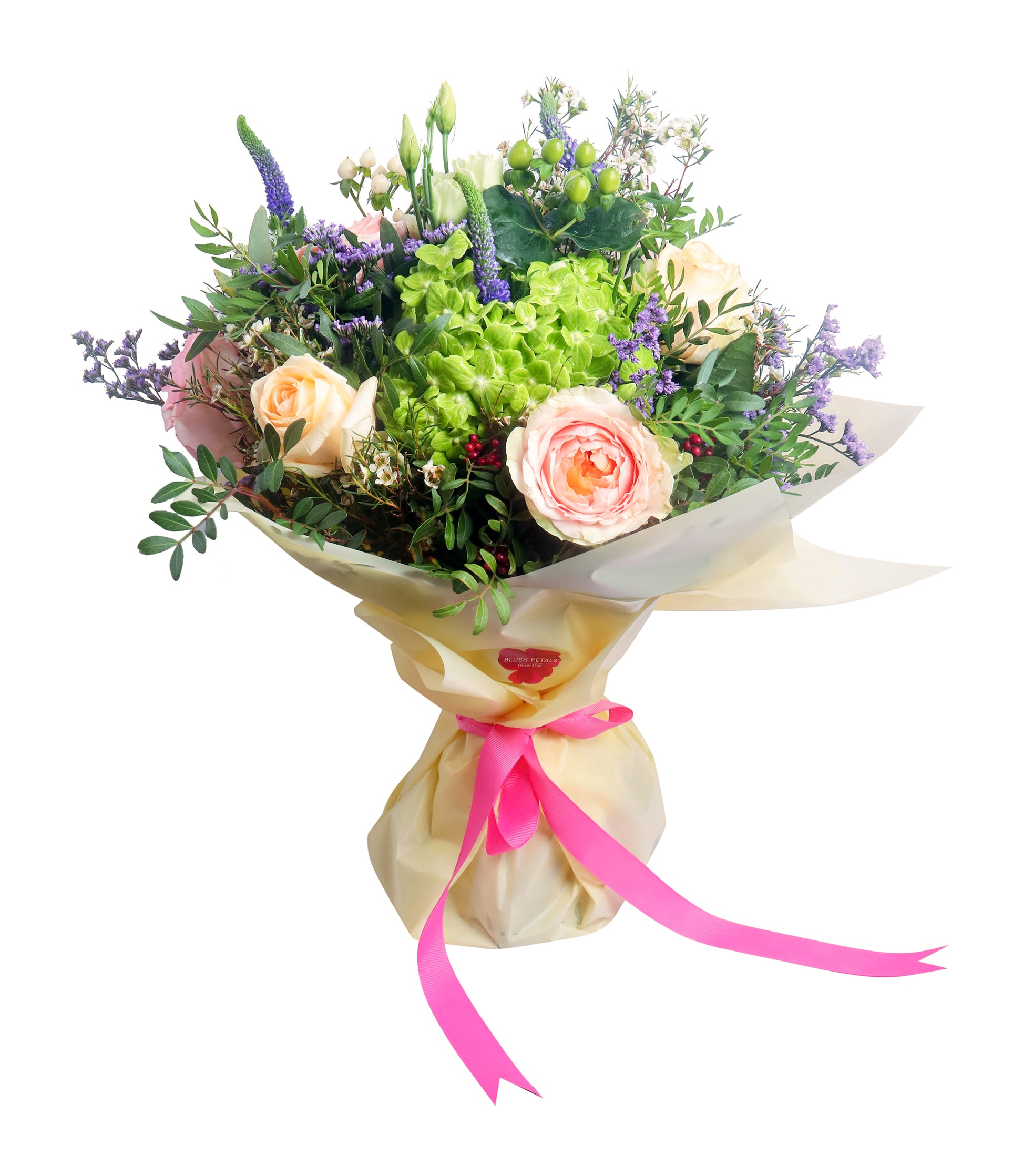 Lift their spirits with the Spring Fling bouquet – a refreshing arrangement featuring lush green hydrangea, delicate peach and pink roses, veronica, lisianthus, and limonium. Accented with vibrant hypericum and fresh pistacia, this cheerful get-well bouquet is perfect for brightening any room and sending wishes of a speedy recovery in Dubai. A gift of beauty, hope, and positivity.