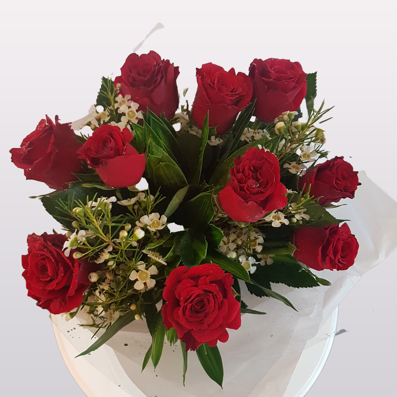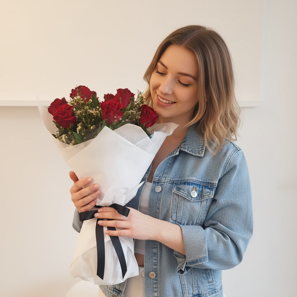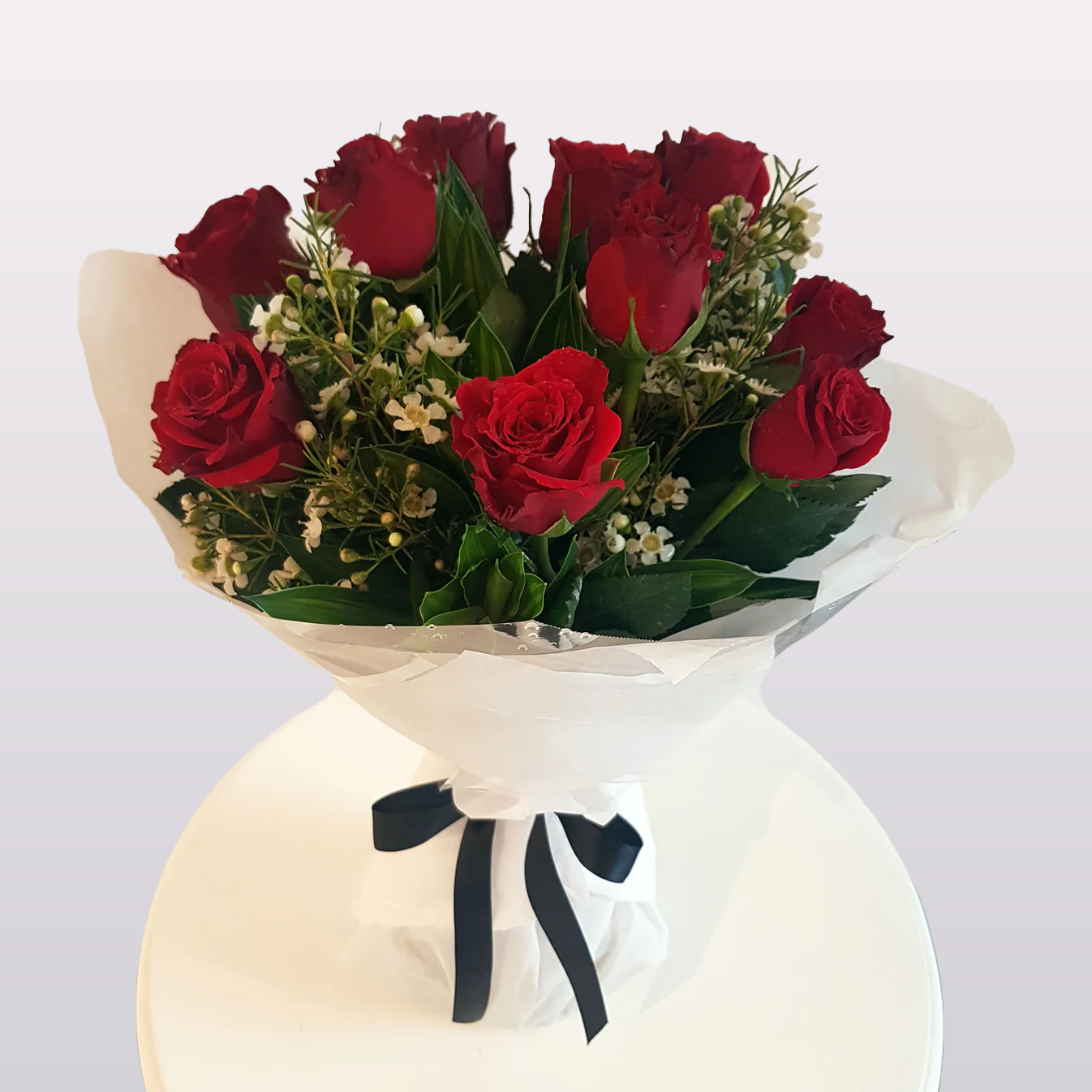 Stylish and timeless, our Tuxedo bouquet features 10 velvety red roses accented with delicate white wax flowers and lush greenery. Wrapped in crisp white paper with a sleek black ribbon, this arrangement exudes sophistication and charm — perfect for romantic gestures, anniversaries, graduations, or any elegant occasion in Dubai. Each bloom is carefully chosen for its freshness and beauty, making it an unforgettable gift for someone special.